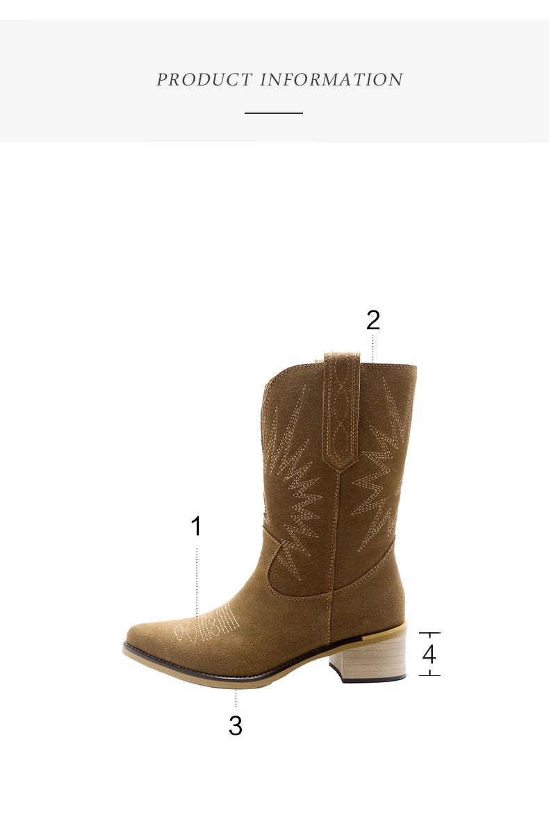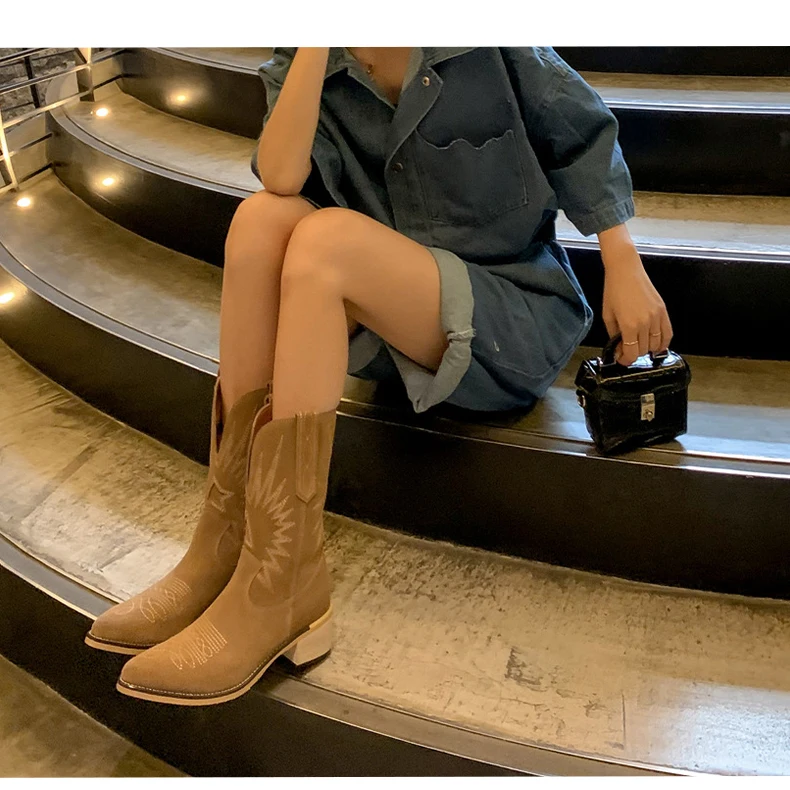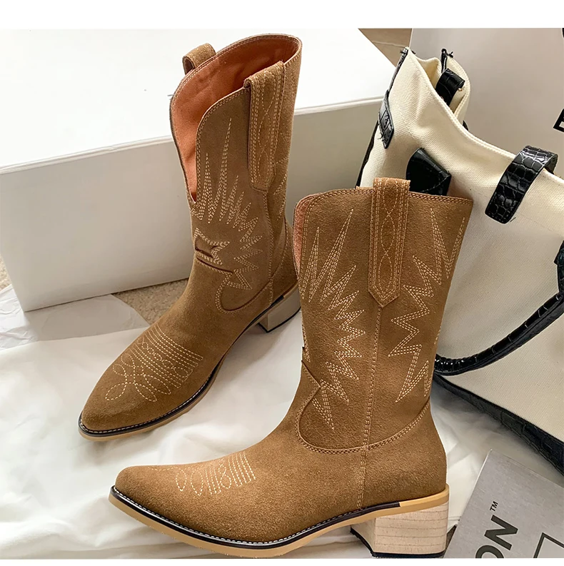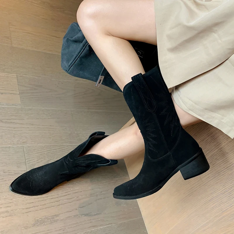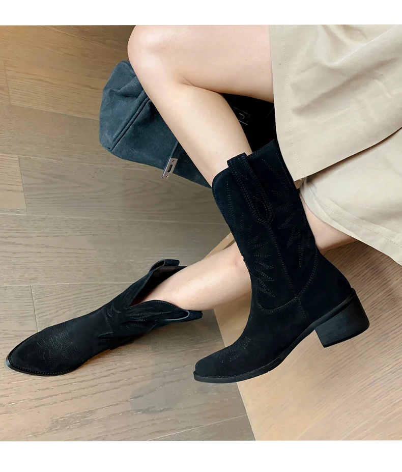 Ботинки женские ковбойские до середины икры, с вышивкой, на блочном каблуке