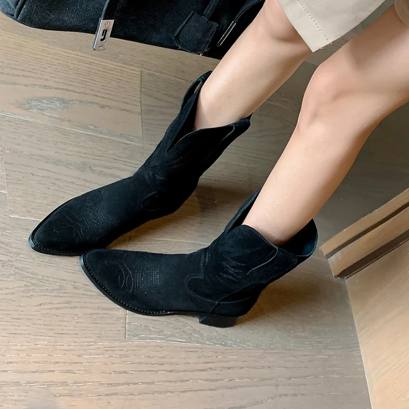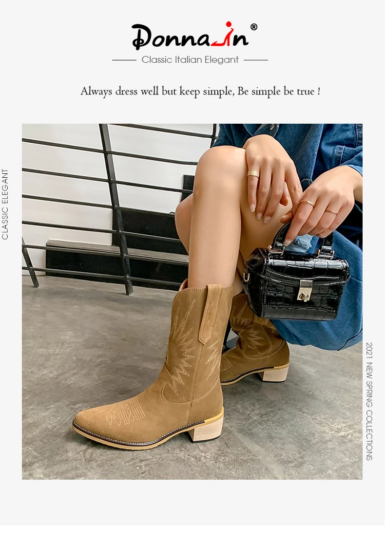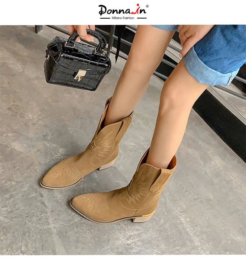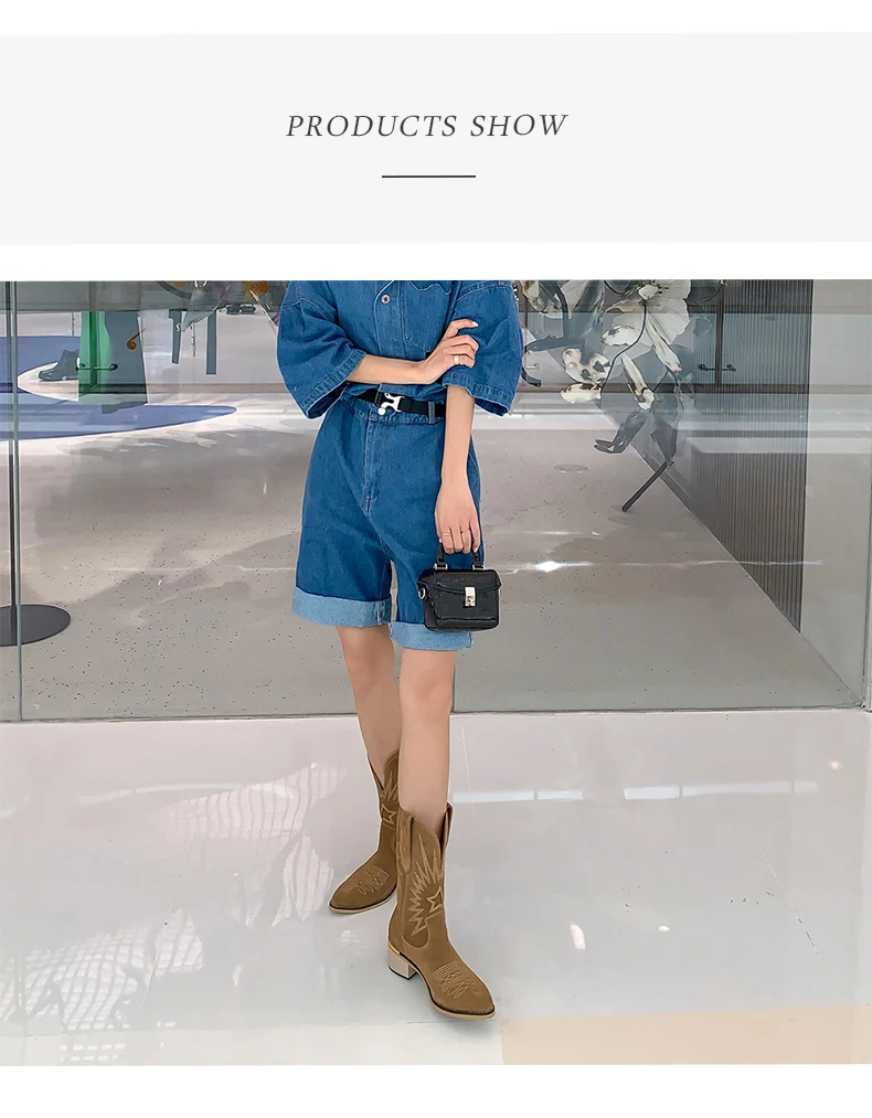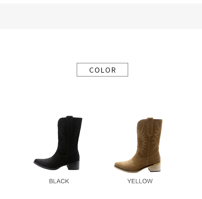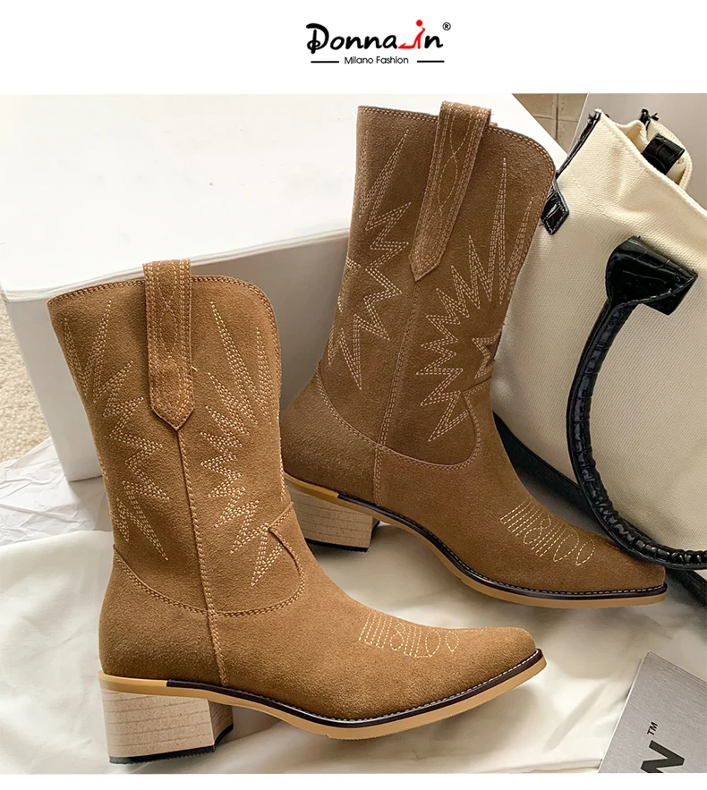 Ботинки женские ковбойские до середины икры, с вышивкой, на блочном каблуке