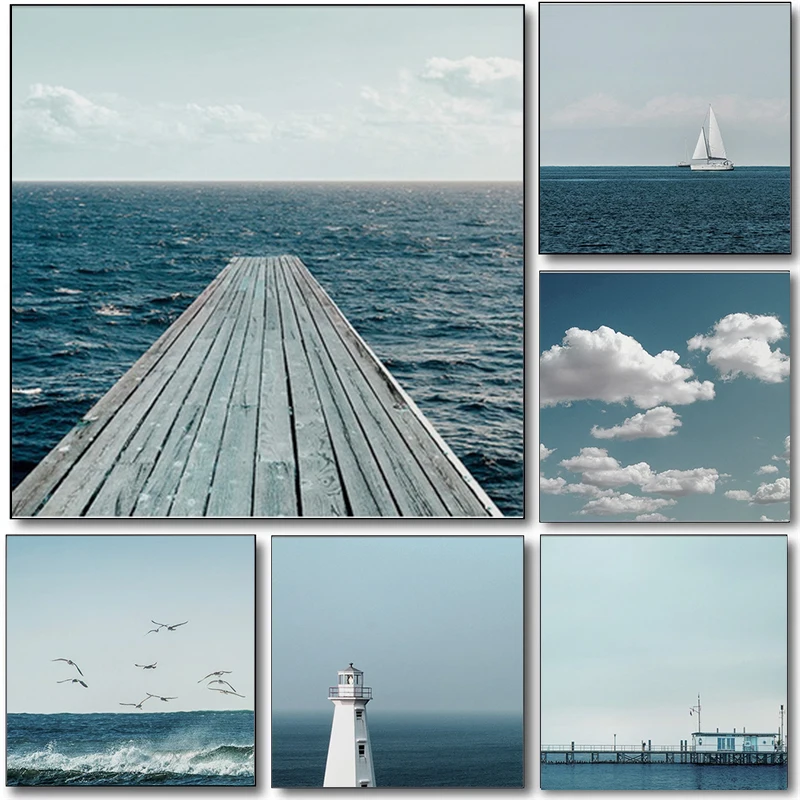 Картина на холсте с изображением Морского Пейзажа голубого неба, облаков, современное искусство, украшение для гостиной, картина, печатный плакат