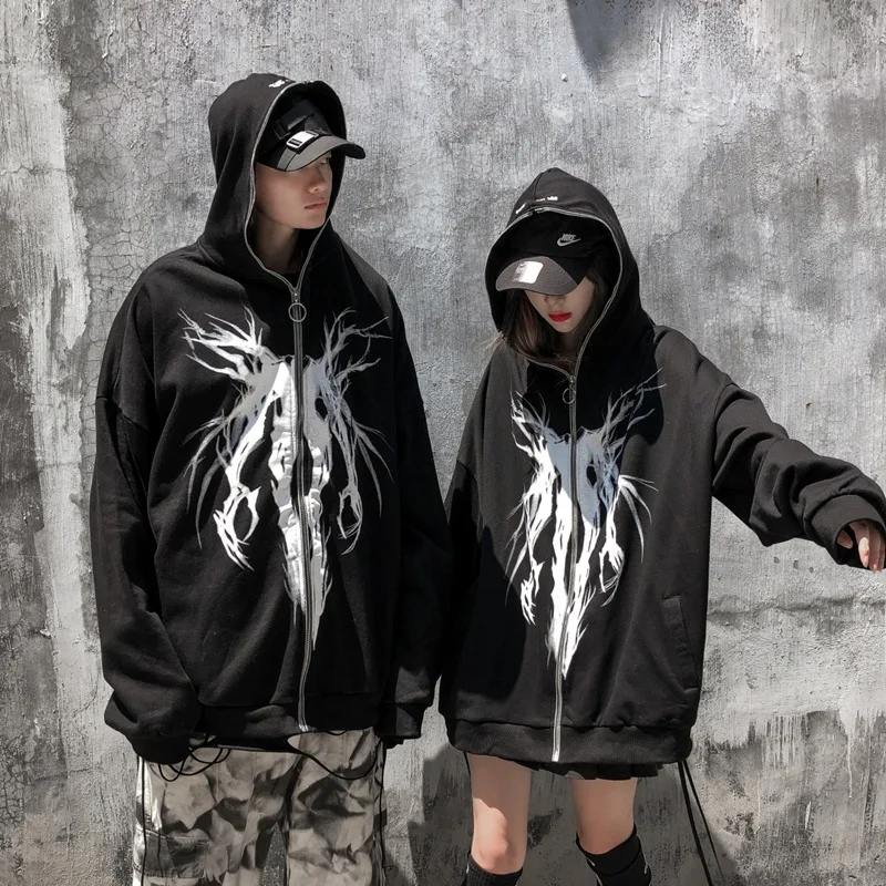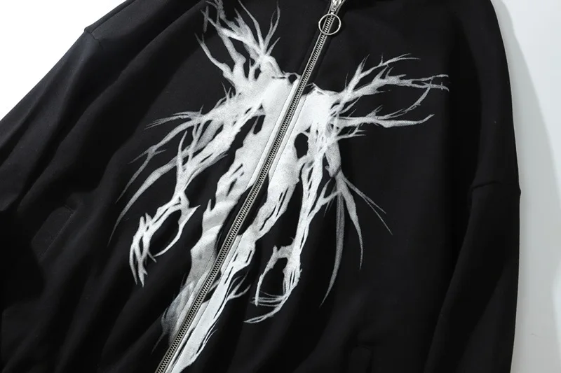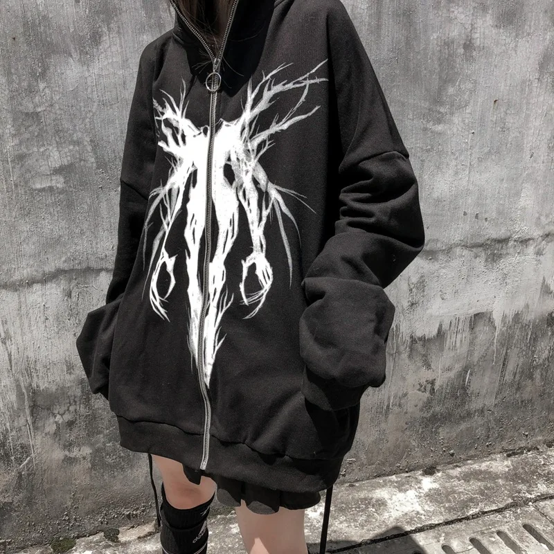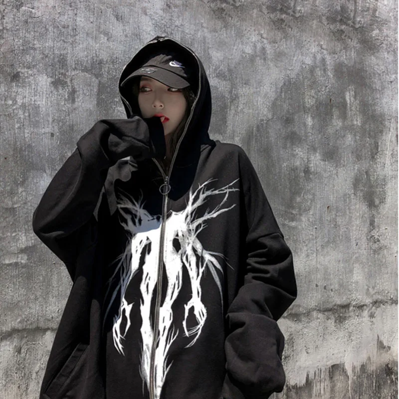 Женская толстовка с капюшоном, черная Повседневная Толстовка Оверсайз на молнии с принтом в готическом стиле панк и лентами, осень