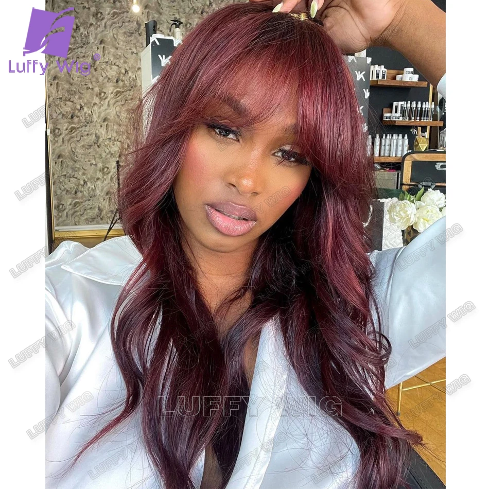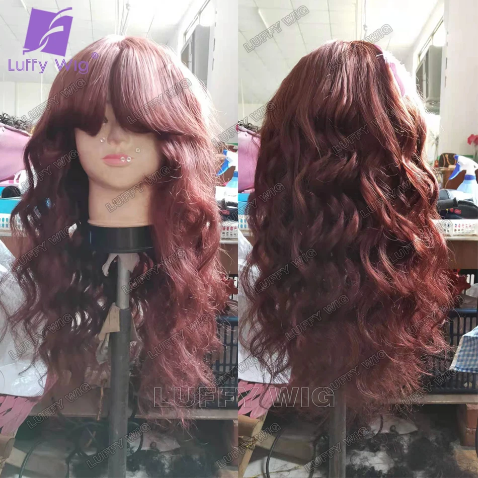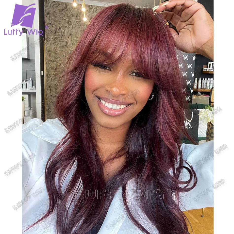 Бордовый волнистый парик полностью машинная работа парик с челкой 180 плотность # 99j бразильские человеческие волосы Remy парики для женщин Luffywig