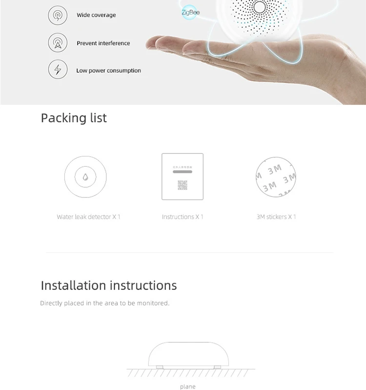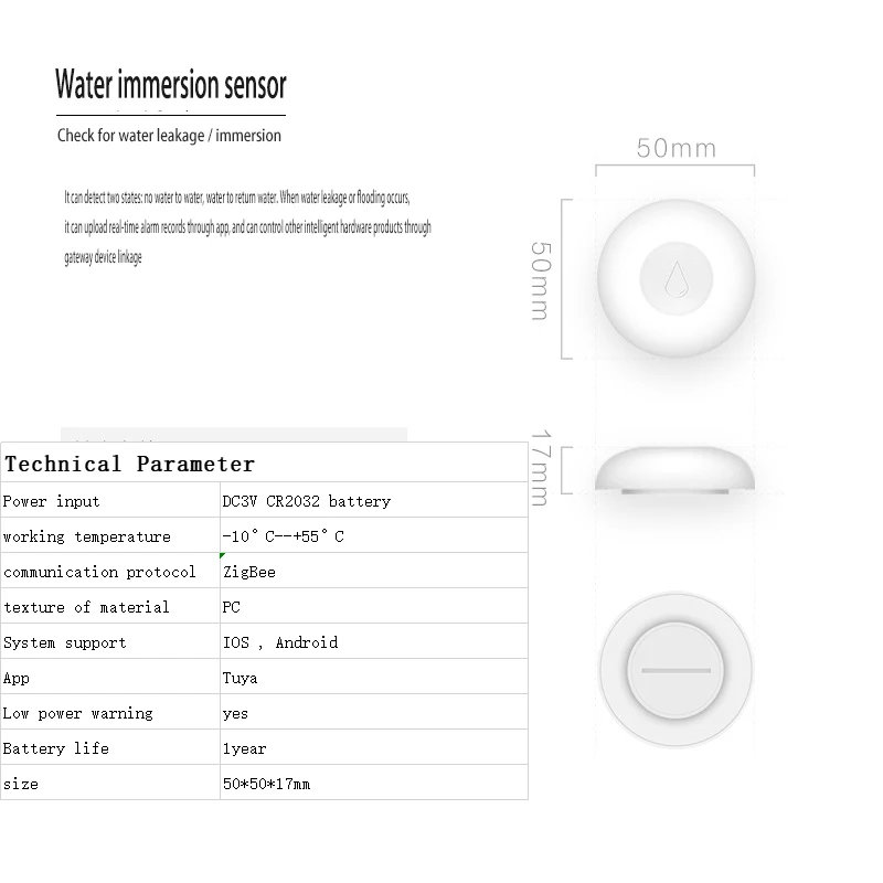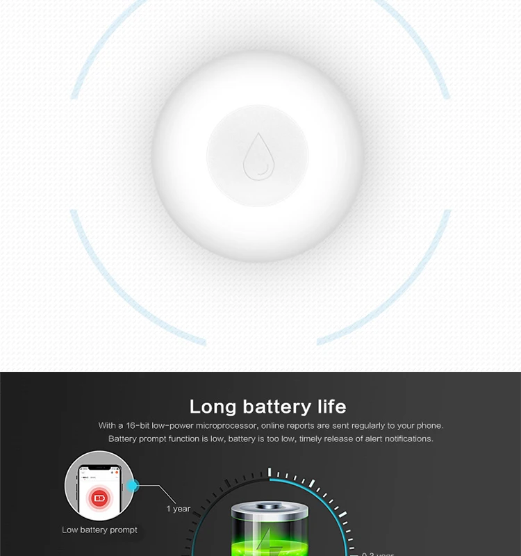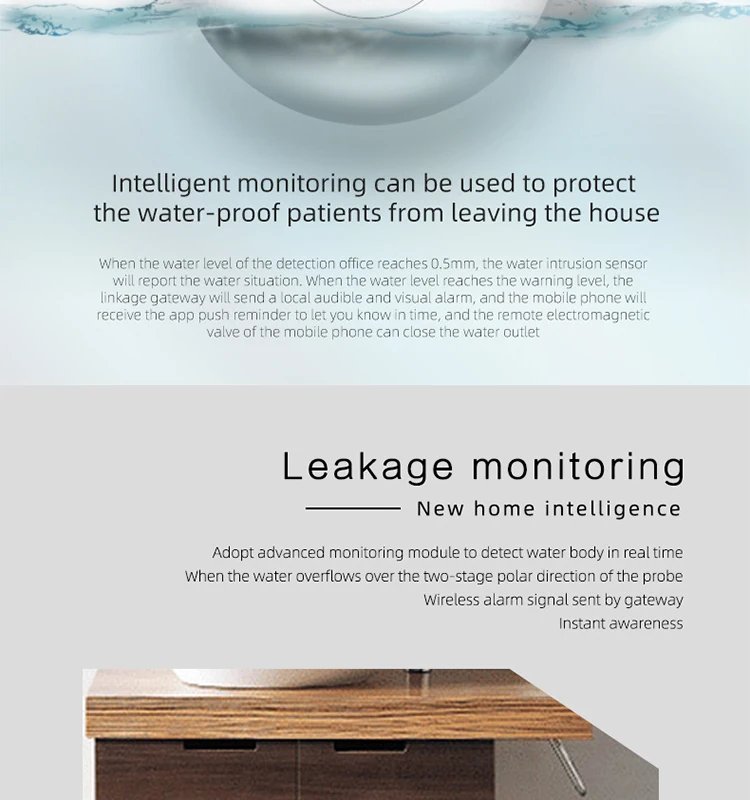 【Обнаружение в реальном времени】Датчик погружения в воду, который может обнаруживать утечку воды в окружающей среде в реальном времени. При обнаружении погружения в воду детектор отправит сигнал тревоги на хост и сообщит информацию на мобильный телефон пользователя. В тех случаях, когда уровень воды на обнаружение точка не достигнет 0,5 мм воды датчик вторжения сообщит о качества воды.