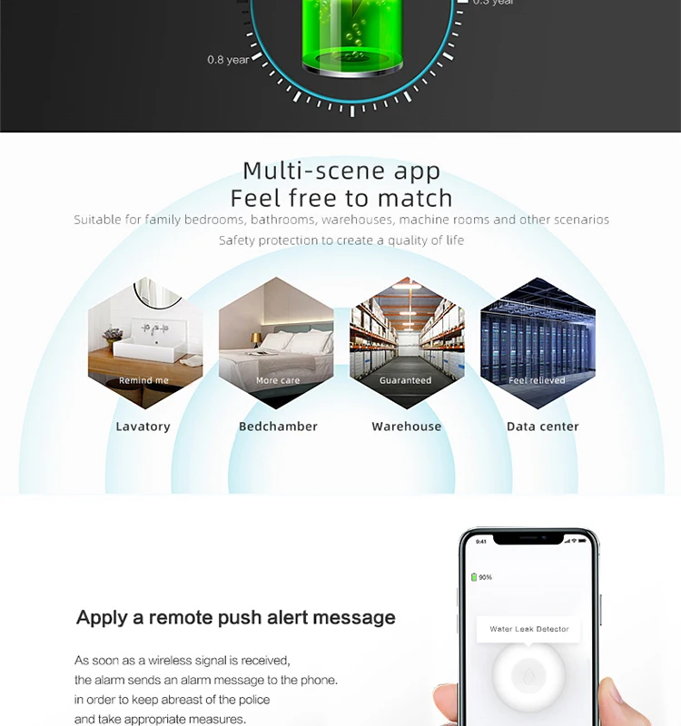 【Многоуровневое применение】Детектор утечки воды может нормально работать в домах, гостиницах, магазинах, офисах и квартирах. Защитите каждый момент.