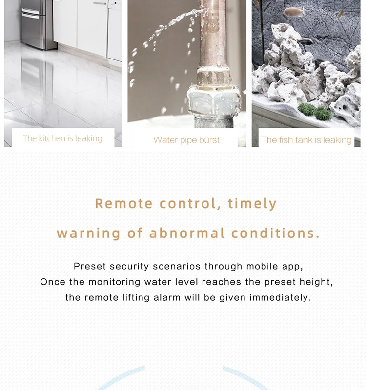 【Сценическая связь】Предустановленная сцена безопасности реализуется через мобильное приложение. Как только уровень воды под контролем достигнет заданной высоты, будильник будет поднят удаленно. Когда ранний уровень воды будет достигнут, шлюз связи отправит сигнал локального звука и светильник, и мобильный телефон получит приложение push reminder, чтобы сообщить вам вовремя, И мобильный телефон может закрыть выход воды удаленным электромагнитным клапаном