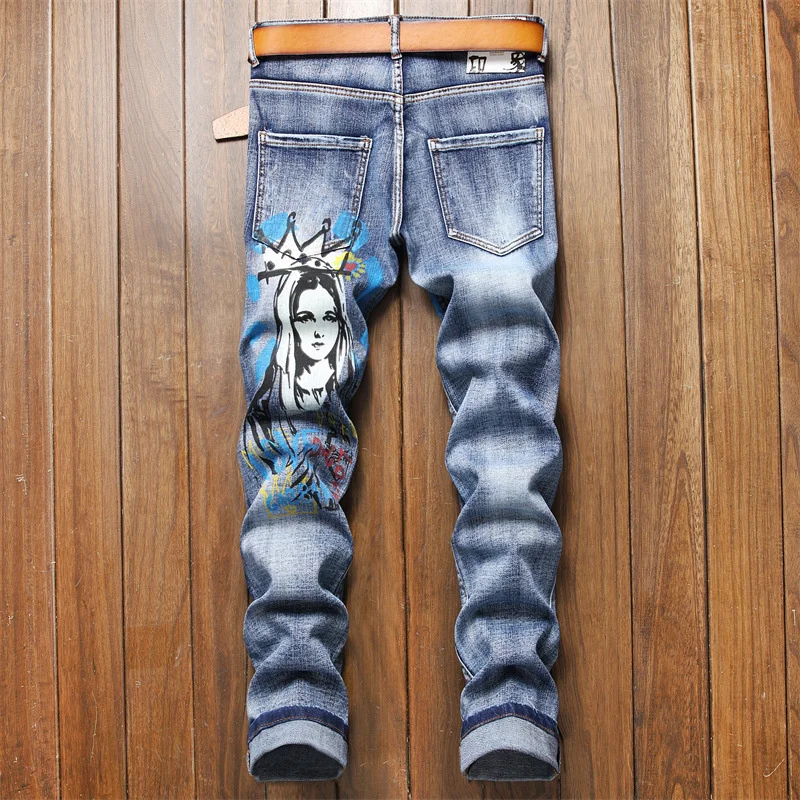 Мужские джинсы с принтом Девы Марии, Модные Узкие Стрейчевые джинсо...