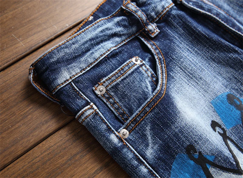 Джинсы мужские с рисунком, Модные приталенные прямые Стрейчевые брюки из денима в стиле хип-хоп