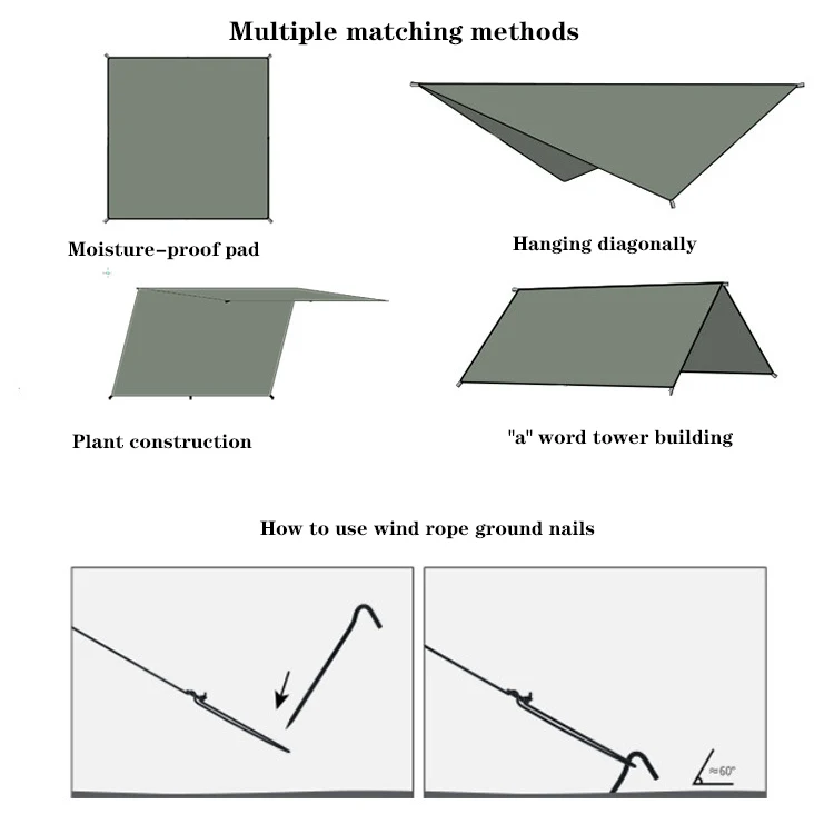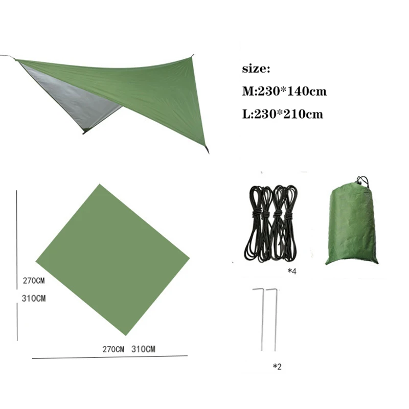 Особенности:Этот продукт имеет широкий спектр применений. Его можно использовать как занавеску на день или как влагостойкую напольную ткань, коврик для пикника, он компактный и удобный для переноски. Используется с гамаком для защиты от солнца и дождя.