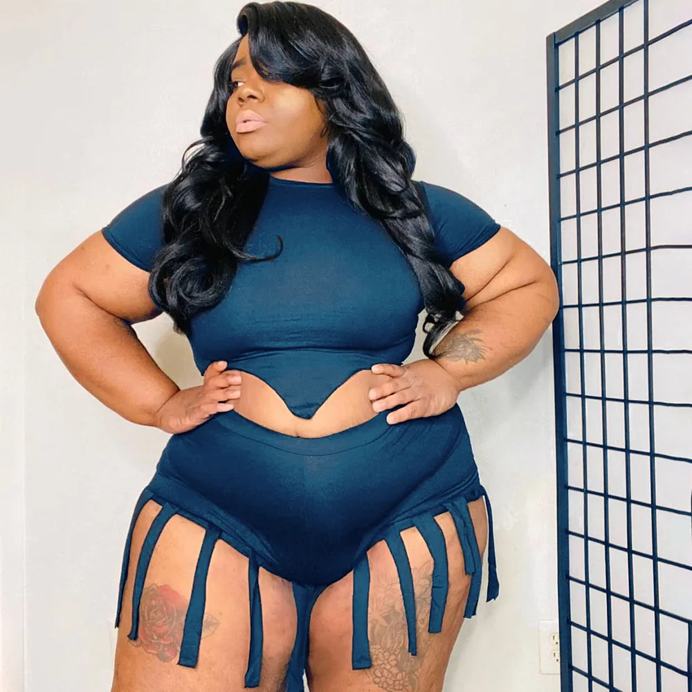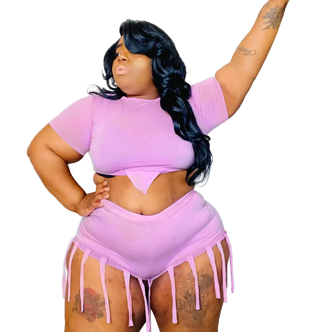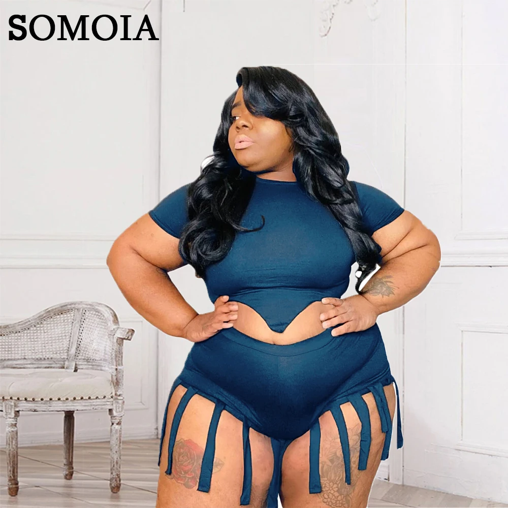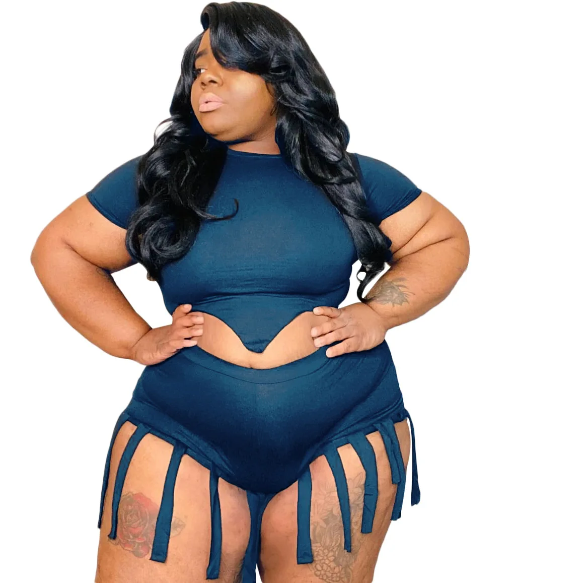 Летняя женская одежда Twopiece больших размеров, индивидуальный сексуальный однотонный Модный повседневный спортивный костюм с кисточками и круглым вырезом и коротким рукавом