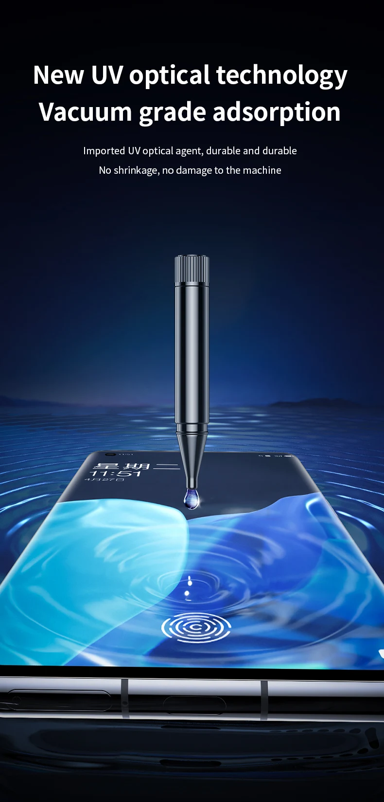 19. Подключите питание и включите УФ-светильник20. Проведите влево и вправо, пока светильник не погаснет автоматически, чтобы он равномерно просвечивал на экране, чтобы высушить клей21. Аккуратно нажмите на экран пальцами и снимите установочную рамку вертикально вверх22. После удаления рамки протрите клей, который проливается вокруг экрана23. Включите УФ-светильник, чтобы осветить обе стороны изогнутого экрана24. Готовый