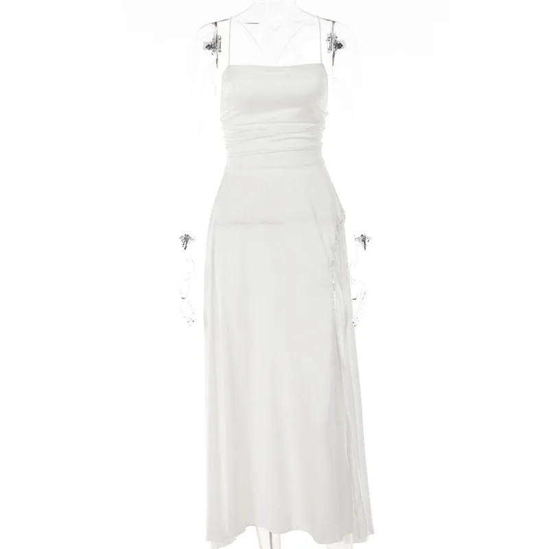 Платье на бретелях-спагетти, белое, с высоким разрезом, с открытой ...