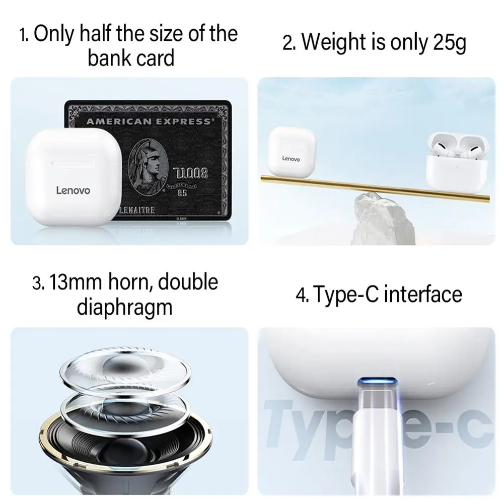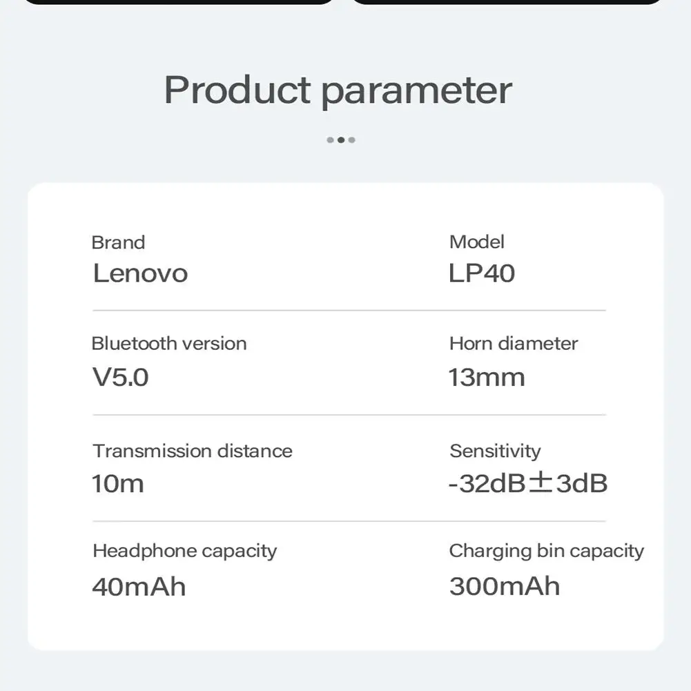 Описание: Название: беспроводные наушники Название бренда: Lenovo Номер модели: LP40 Версия BT: 5,0 Расстояние передачи: до 10 м (без препятствий) Диаметр привода: 13 мм Частотный диапазон: 20-20 кГц Чувствительность динамика: 98дБ Чувствительность микрофона: -32 дБ ± 3 дБ Сопротивление: 32 Ом Зарядный чехол Батарея Ёмкость: 3,7 V 300mAh Наушники Батарея Ёмкость (каждый): 3,7 V 40 мА * ч Время воспроизведения музыки: около 3 часов (зависит от громкости музыки) Цвет: черный, белый (по желанию) Вкладыши Вес (каждый): 3,2g/0,11 oz Размер посылка: 8,7*8,7*2,8 см/3,42*3,42*1,10 унций Вес посылка: 64 г/2,25 унций Характеристики: настоящий беспроводной дизайн с двумя ушами, левый и правый каналы наушников разделены. Его можно использовать исключительно или парами. Обзор: Технология BT 5,0 обеспечивает высокую скорость передачи данных, стабильную производительность и низкое энергопотребление. С помощью технологии TWS вы можете использовать гарнитуру или использовать их в паре. Оснащен зарядным устройством емкостью 300 мАч для хранения и зарядки наушников. Встроенный микрофон обеспечивает более четкий и реалистичный звук. Это принесет вам идеальный пользовательский опыт. Упаковочный лист: 1 * пара наушников 1 * чехол для зарядки 1 * зарядный кабель 1 * Руководство пользователя (английский/китайский) Примечание: Из-за различных личных причин; Дисплеи, светильник, а также контрастности монитора каждого вас принять во внимание тот факт, быть s светильник разница в цвете между фотографией и фактическими предметами.
