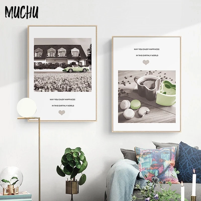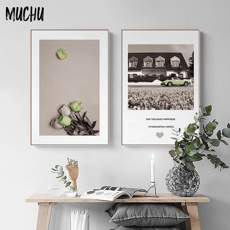 Декоративный постер в скандинавском стиле, настенная Картина на холсте с изображением дома, автомобиля, розы, чашки зеленого кофе, Настенная картина для гостиной и спальни