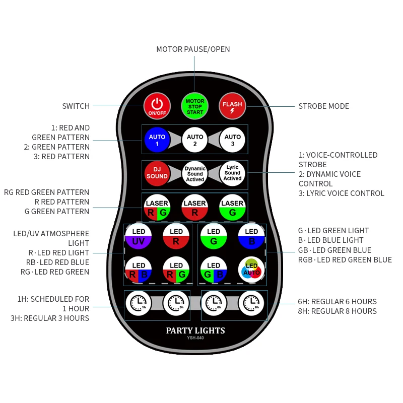 FAQ В1: Клиент: Что мне делать, если мы не получим товар в оговоренный срок? Магазин: мы полностью вам компенсируем В2: Клиент: Что мне делать? Если он поврежден во время транспортировки? Магазин: во-первых, эта вероятность очень низкая, а во-вторых, мы полностью компенсируем Вам, если вы действительно столкнулись с повреждениями во время транспортировки. Будьте уверены. Название продукта: фигурный лазерный светильник 128 с 8 отверстиями 1. Модель: YSH-042 2. Источник питания: 5 В постоянного тока/2 А 3. Мощность: 6 Вт 4. Светодиодный источник светильник: три в одном RGB + УФ-лампа 5. Мощность лазера: Красный: 650 нм/Зеленый: 532 нм 6. Режим управления: Стробоскоп/Голосовое управление/самоходный 7. Система сканирования: прецизионный двигатель 8. Режим управления: дистанционное управление 9. Размер внутренней коробки: 10,6*9,6*9 см 10. Вес внутренней коробки: 0,3 кг Если у вас есть какие-либо вопросы, не стесняйтесь оставлять нам сообщение, и мы ответим Вам в течение 24 часов.