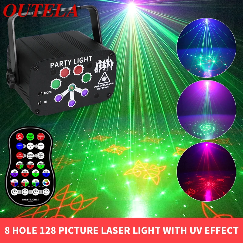 Фигурный лазерный светильник OUTELA, 8 отверстий, 128, сценический светильник, фонарик-проектор, USB разъем, пульт дистанционного управления для бара, KTV