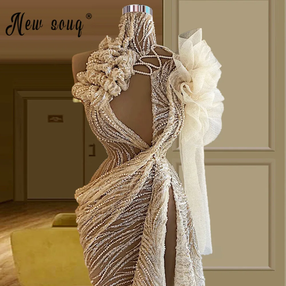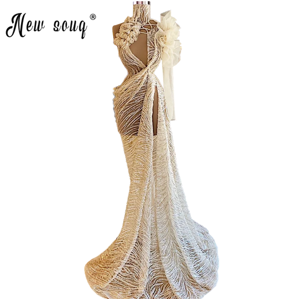 Высокая шея полная Бисероплетение светильник платье для выпускного Шампань 2021 Сексуальная Сплит Сторона Иллюзия вечерние платья день рождения Одежда для женщин