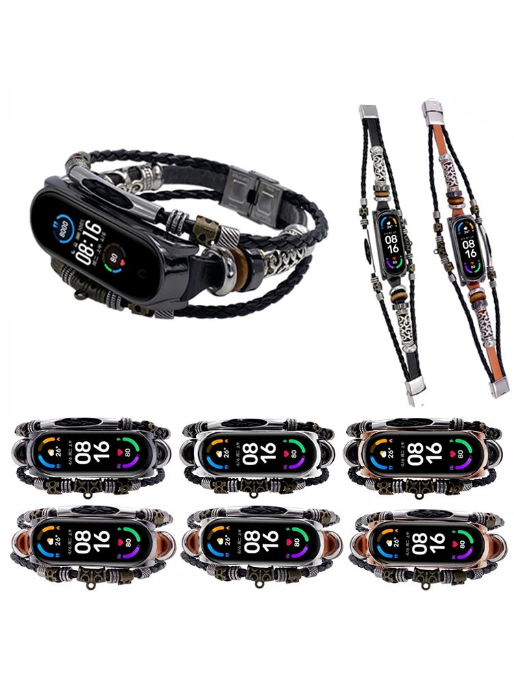 Сменный кожаный ремешок для Xiaomi Mi Band 5 6, сменный плетеный браслет с бусинами для наручных часов