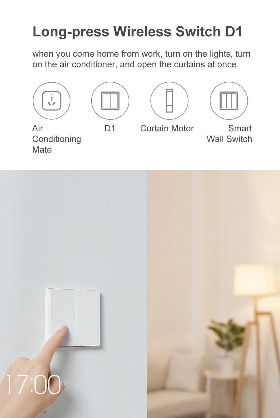Из-за различных внутренних условий Расстояние связи между беспроводным переключателем D1 (настенный) и шлюзом отличается. Как правило, расстояние связи между ними составляет менее 20 метров, и эффект лучше, когда Середина меньше двух стен