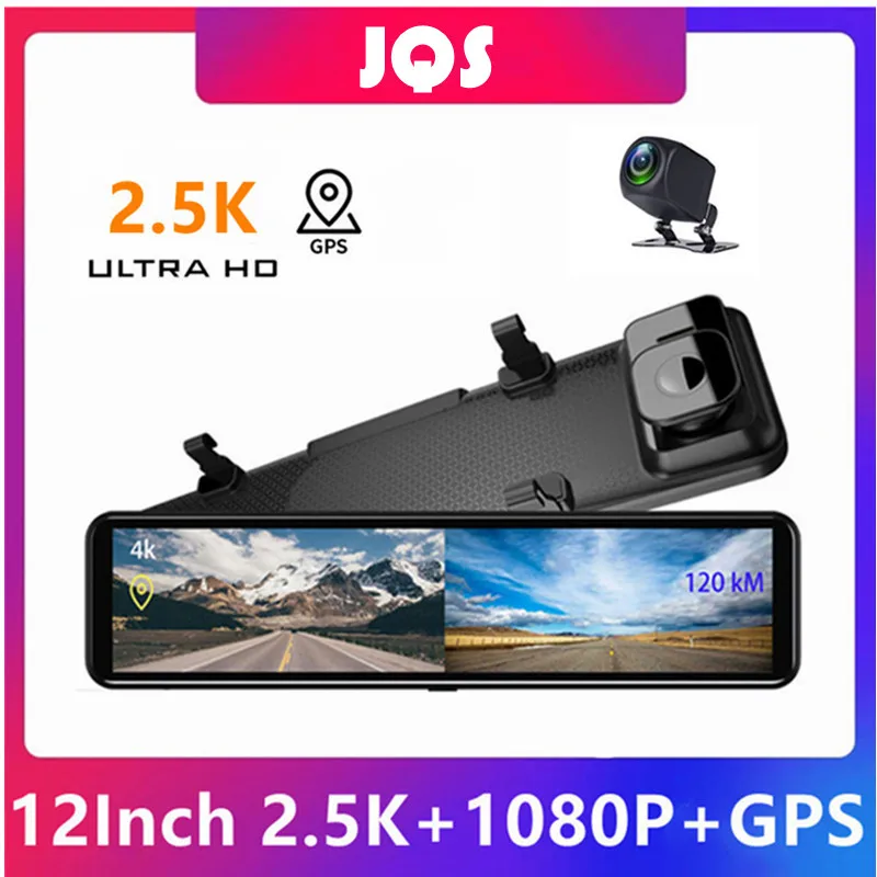 JQS 12 дюймов 2,5 K Автомобильный видеорегистратор с сенсорным экраном потоковая передача медиа двойной объектив видеорегистратор зеркало заднего вида видеорегистратор Передняя и задняя камера
