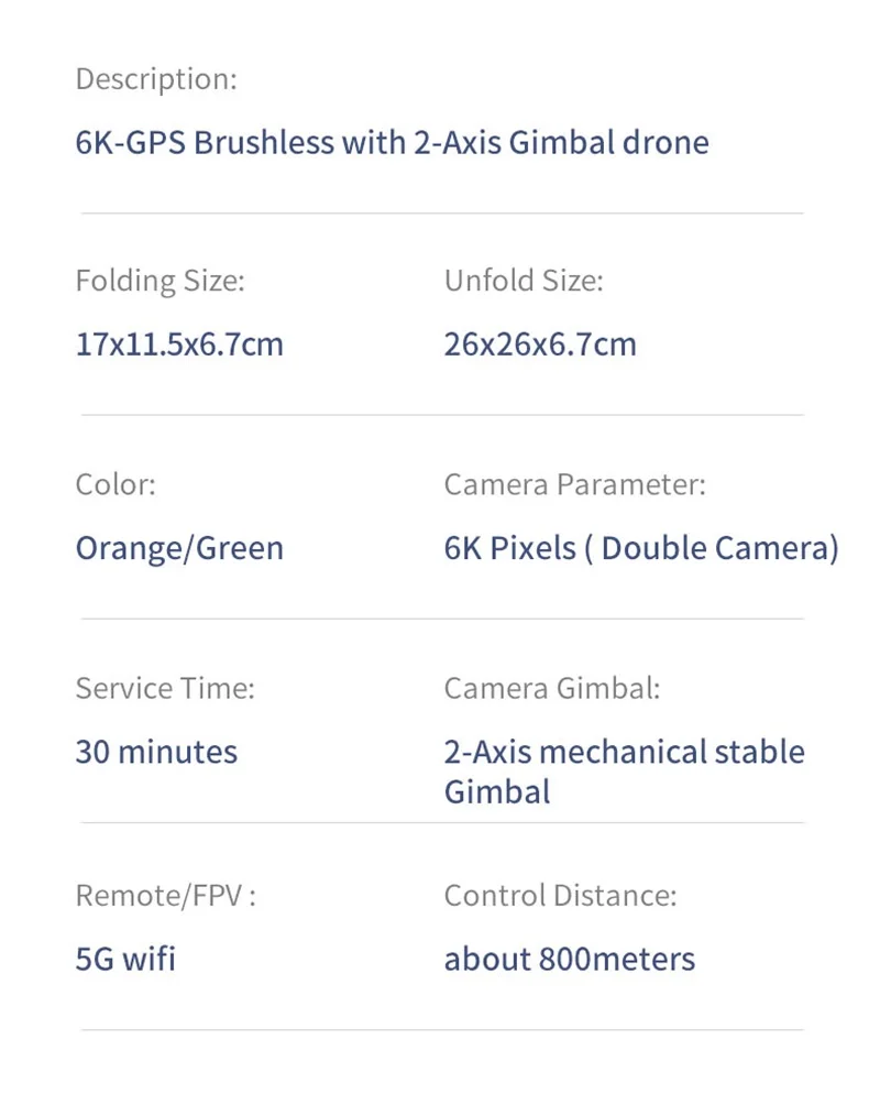 3. В качестве бесщеточного дрона он оснащен профессиональной версией двухосного механического самостабилизирующего карданного шарнира высокой четкости 6K и двойными камерами с широким углом защиты от тряски, стабильная съемка, четкие изображения, регулируемые линзы на 90 ° и поддержка функции свободного переключения с двумя объективами.
