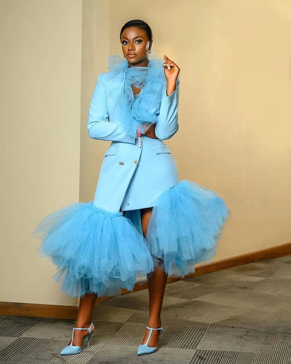 Женский вечерний костюм с оборками, небесно-голубое фатиновое платье до щиколотки, платье для невесты на заказ