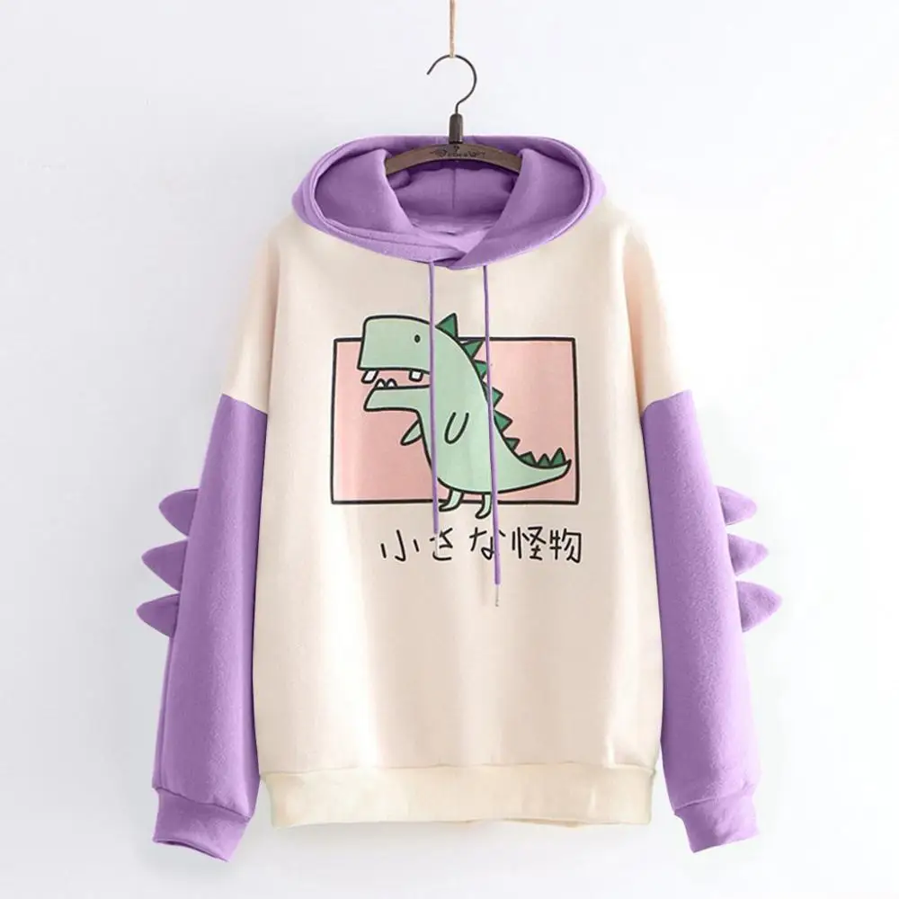 Толстовка женская с капюшоном, Модный свитшот в стиле оверсайз с мультипликационным принтом динозавра, утепленная уличная одежда в Корейском стиле, топ с капюшоном в стиле Харадзюку