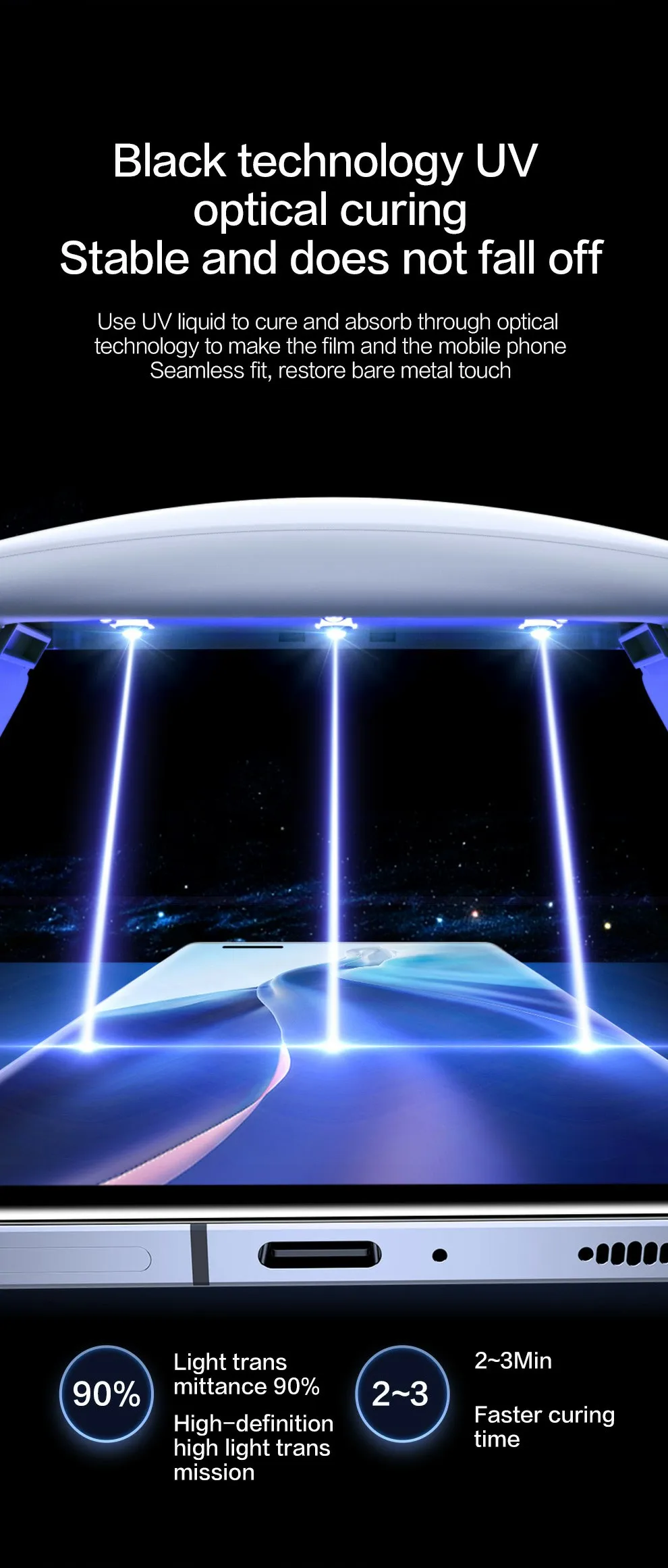 19. Подключите питание и включите УФ-светильник20. Проведите влево и вправо, пока светильник не погаснет автоматически, чтобы он равномерно просвечивал на экране, чтобы высушить клей21. Аккуратно нажмите на экран пальцами и снимите установочную рамку вертикально вверх22. После удаления рамки протрите клей, который проливается вокруг экрана23. Включите УФ-светильник, чтобы осветить обе стороны изогнутого экрана24. Готовый
