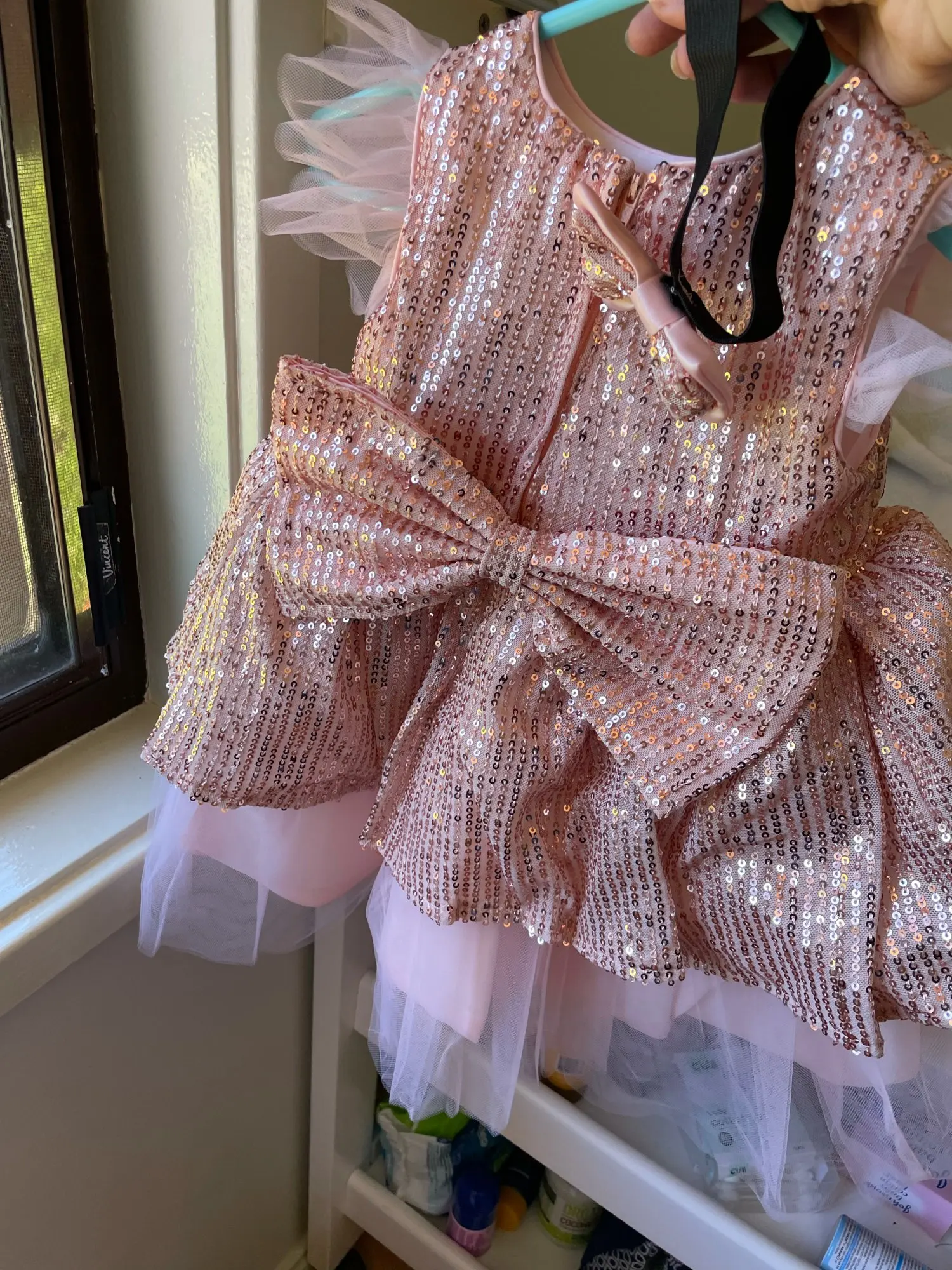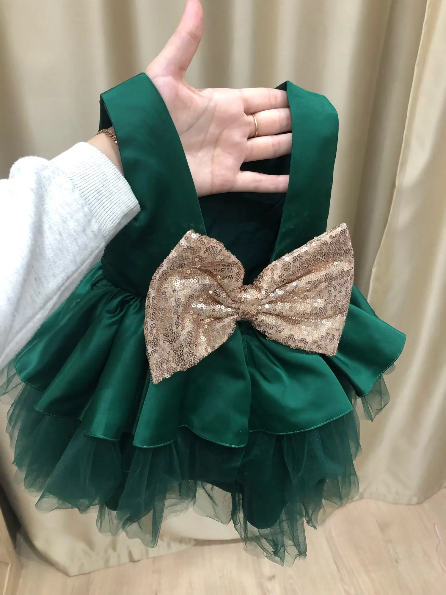 Prachtig. Heel blij me de kwaliteit is heel goed. En de prijs helemaal. Is precies als op de foto. De strik achter kan je verplaatsen en dat is goed. Was al bang met zo een grote strik maar ben dr heel blij mee. KOPEN KOPEN KOPEN! Heel leuk voor feestdagen.