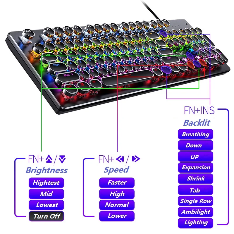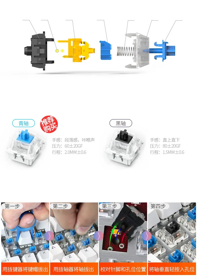 Название: Механическая клавиатура Кнопка клавиатуры: 104 клавиши Переключатель клавиатуры: зеленый/черный/коричневый вал на выбор Клавиатура с подсветкой: Смешанное освещение Кабель клавиатуры: около 1,6 метр Размер клавиатуры: 448x178x38мм Вес клавиатуры: 1,12 кг Поддержка системы: Windows 2000/XP/7/8/10 и MAC