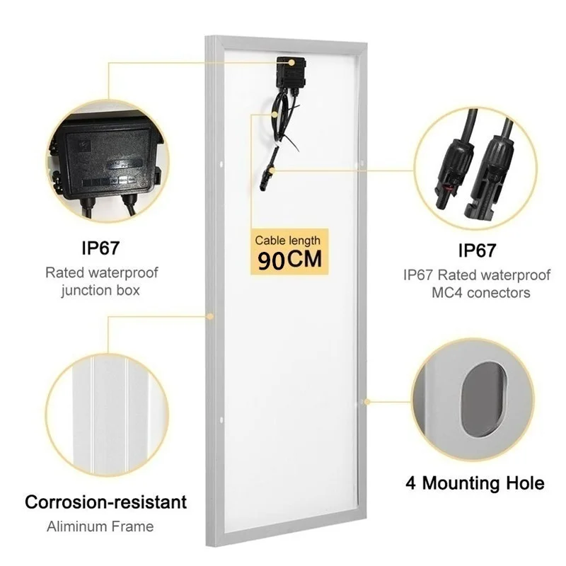 Можно удобно разместить на изогнутых твердых поверхностях Легче и тоньше, толщина всего 3 мм. Встроенный блокирующий диод для предотвращения разрядки батареи в ночное время Все погодные условия. Они водонепроницаемы и устойчивы к ультрафиолетовому излучению. Распределительная коробка в горшке