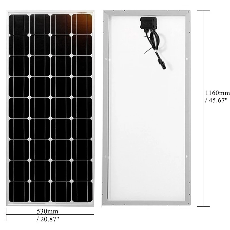 Номинальная мощность 100 Вт Рабочее напряжение (Vmp) 18 напряжение Напряжение открытого замыкания (Voc) 21,6 напряжение Ток короткого замыкания (Isc) 6,06 A Рабочий ток (Imp) 5.55A Допуск на выход ± 3% Максимальное напряжение системы 1000V DC(IEC)/600V DC (UL) Диод 2 проходом Распределительная коробка IP 65 Номинальная Диапазон температур-40 градусов до 80 градусов Рама из тяжелого и твердого алюминиевого сплава Вид стекла 3,2 мм закаленное стекло Выходной кабель 2,5 мм 90 мм (0,09*3,54 дюйма) Размеры 1160*530*25 мм Вес 6,5 кг