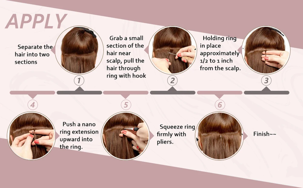 1. Разделите волосы на две секции2. Возьмите небольшую часть волос возле головы, потяните волосы через кольцо с помощью крючка