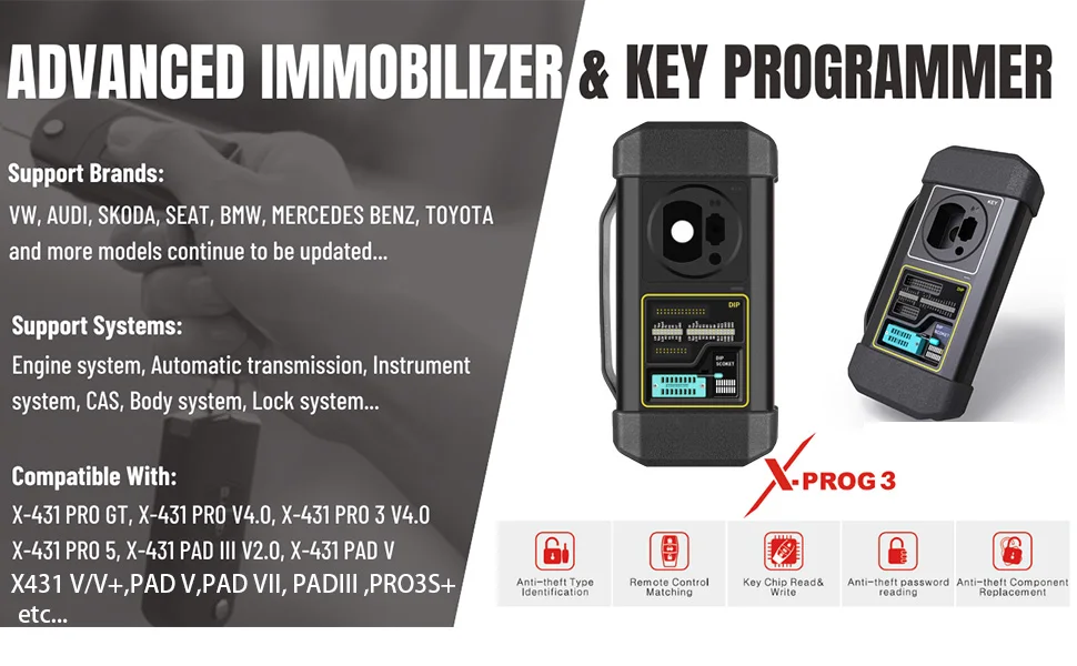 Launch X431 V + работает с X-PROG 3 автомобиля Иммобилайзер программист ключ программист инструмент поддерживает EEPROM чтение и запись ключ чтение и записьX-PROG 3 может быть произвольно сочетается с различными х-431 использованием продукта, нет необходимости связывать, гибкое использование, стабильный и надежный продукт.