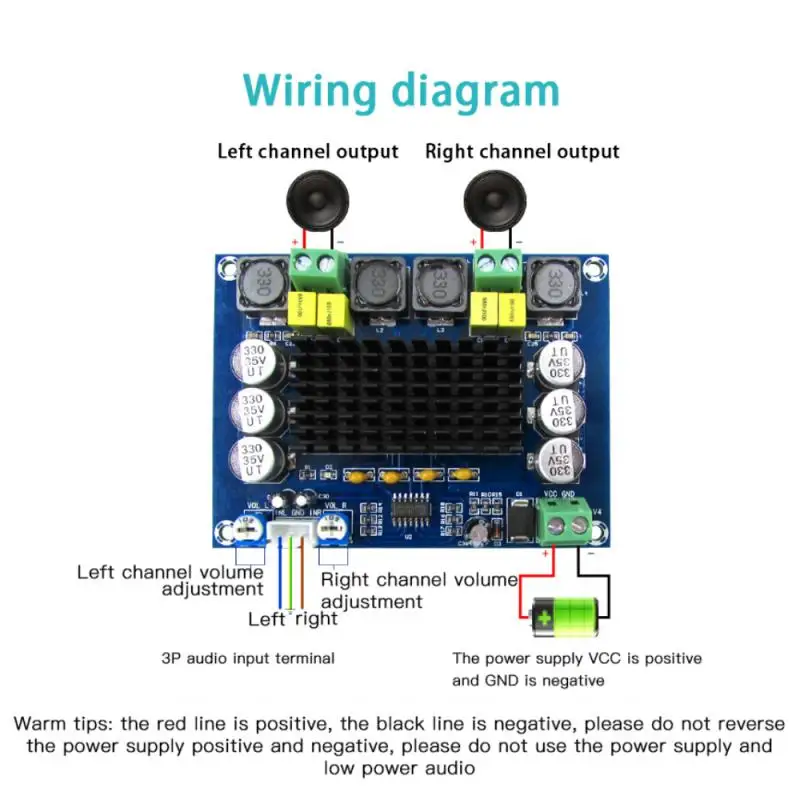 3. Выходная мощность: Пожалуйста, подключите динамик к выходному концу платы 0UT и обратите внимание на положительные и отрицательные полюсы!