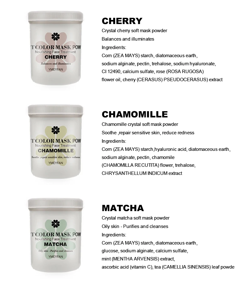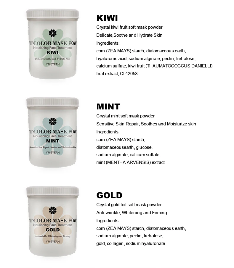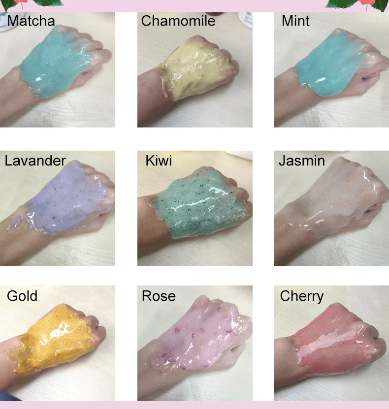9 видов: золото, роза, лаванда, киви, вишня, жасмин, шамомиль, матча, мятаРоза:Выравнивает и осветляет цвет лицаРомашки:Успокаивает, восстанавливает чувствительную кожу, Уменьшает покрасненияКиви:Нежная, Успокаивающая и увлажняющая кожаЛавандер:Разглаживает, питает и освежает кожуВишня:Балансирует и освещаетЗолото:Против морщин, осветляет и укрепляетМаття:Жирная кожа-очищает и очищаетМята:Чувствительная кожа восстанавливает, успокаивает и увлажняет кожуЖасмин:Осветляет, увлажняет и увлажняет кожуЭтот продукт состоит из различных растительных экстрактов с аминокислотами, витаминами, активными белыми факторами и так далее.Уникальные Антивозрастные наногенные элементы в сочетании с активным золотым фактором могут эффективно разблокировать микроциркуляцию,Разбавляет меланин, препятствует образованию пятен, улучшает и устраняет пигментацию и различные пятна, вызванныеДлительное воздействие компьютерного излучения. Специально добавьте различные растительные экстракты, которые эффективно смогутДобавьте питательные вещества, необходимые коже. Повысьте справедливость и блеск кожи, сделайте ее белее и яркой,Жизненная сила и яркость, делают кожу здоровой.Направления:1. После очищения нанесите от 15 до 20 граммов порошка маски в чистую миску, добавив очищенную воду в соотношении 4:3 (или используйте базовую воду в нашем магазине).2. Быстро перемешайте в течение 1-2 минут до однородной пасты.