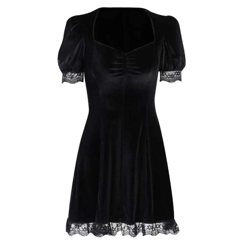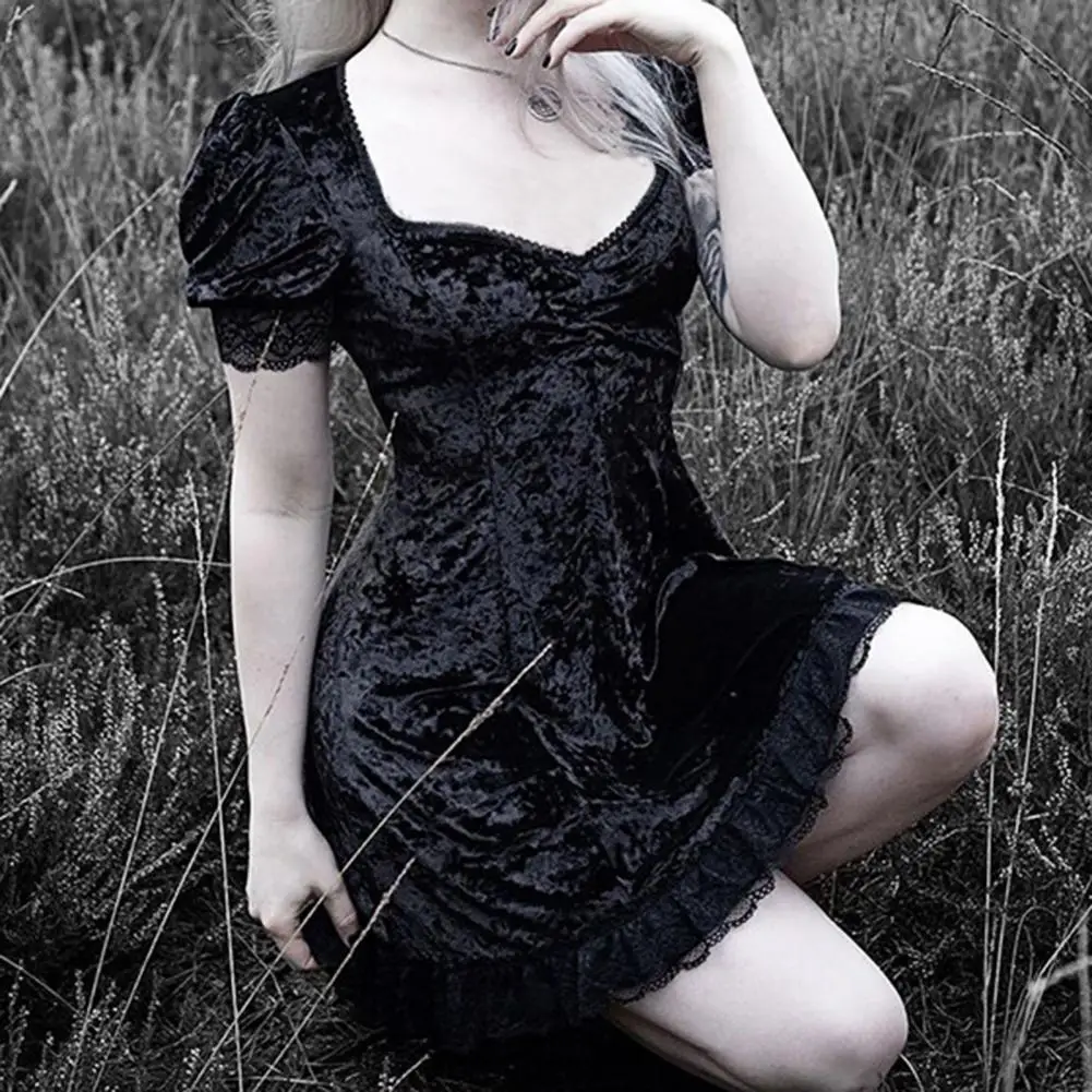 Женское кружевное мини-платье с высокой талией, коротким рукавом-фонариком и квадратным вырезом, черное платье для вечерние, 70%