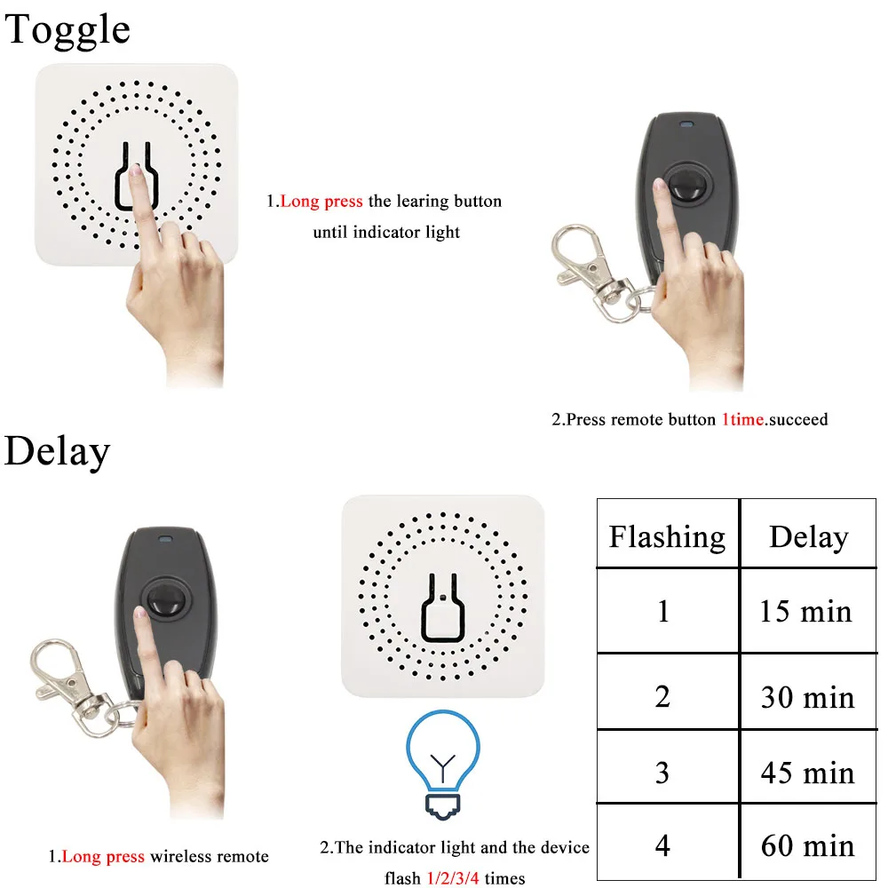 Два режима для радиочастотного беспроводного управления Режим переключения: Нажмите кнопку дистанционного управления, модуль работает, нажмите то же самоеКнопка дистанционного управленияСнова, модуль останавливается Режим задержки:Если устройство включено, режим задержки выключится, если устройство выключено, режим задержки будет включен Как настроить Переключатель:1. Нажмите кнопку обучения модуляПока индикатор не загорится2. Нажмите кнопку настенный выключатель1 раз, ПреуспеваетЗадержка:1. Длинный pБеспроводной настенный выключатель 2. Светильник индикатора и устройствоВспышка 1,2,3,4 раз3. Время задержки в 15,30,45,60 минут Примечание: Если переключатель будет работать снова после режима задержки, режим задержки будет отменен.Если установлен новый режим задержки, предыдущий режим задержки будет перезаписан