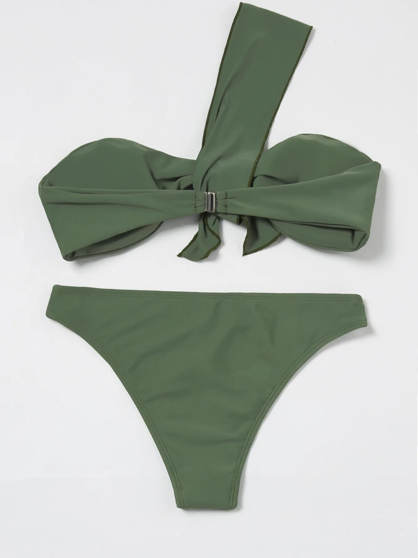 Купальник-бикини женский на одно плечо, однотонный зеленый купальни...