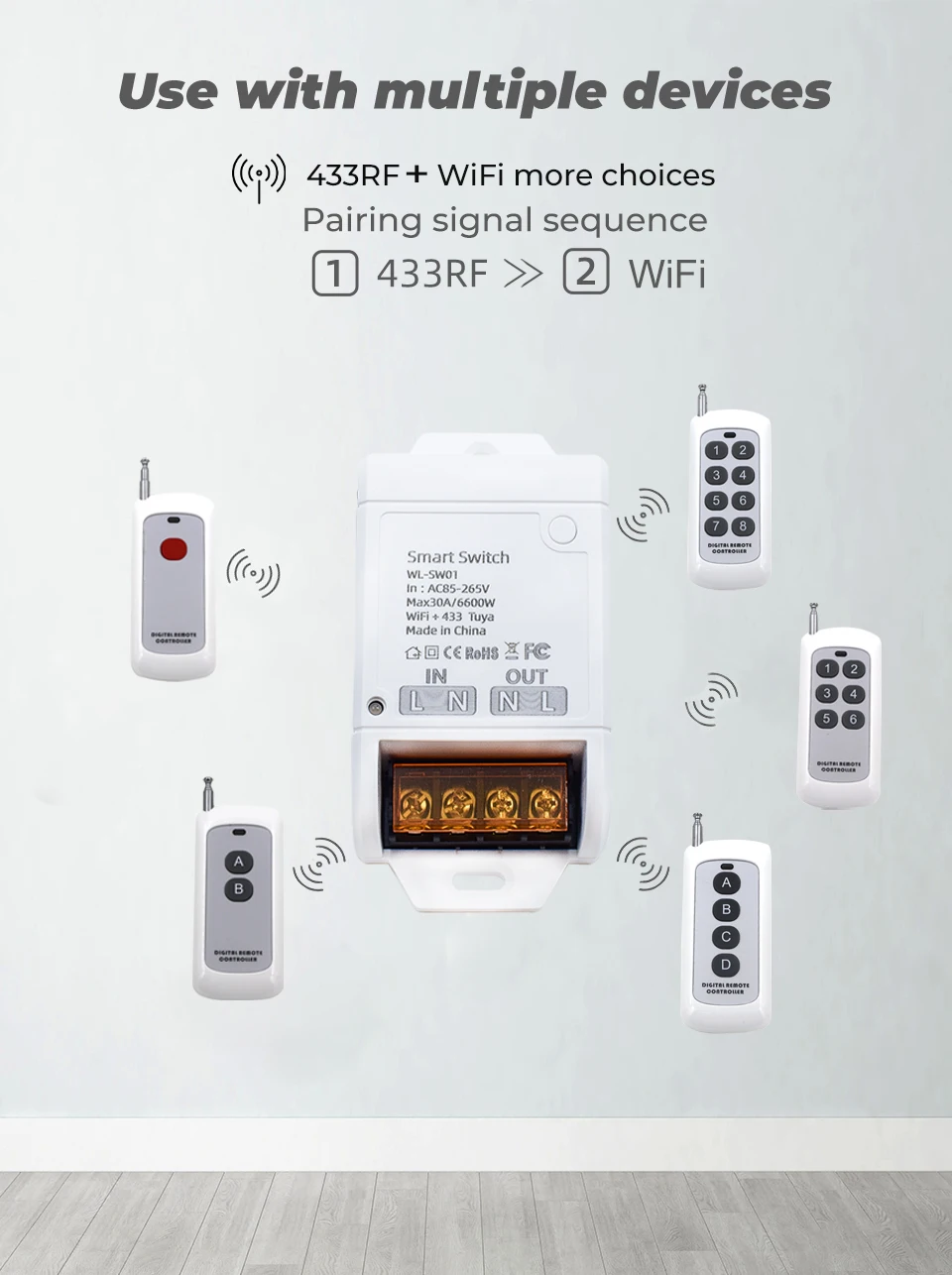 * Напряжение: AC90-260V 50/60Hz * Max30A/6600 Вт * Частота WIFI: 2,4G. Ieee 802,11 b/g/n * Частота дистанционного управления: 433 МГц * Аккумулятор в комплект не входит