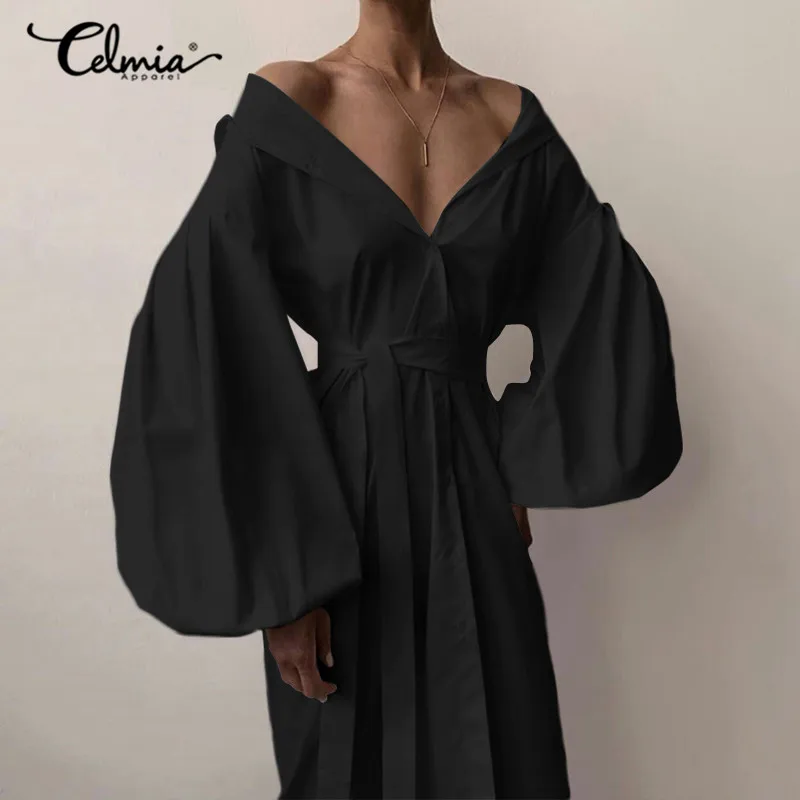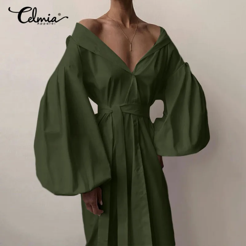 2021 Celmia модные женские платья-миди с рукавами-фонариками и поясом, рубашка с воротником-стойкой, повседневные свободные платья на пуговицах с поясом