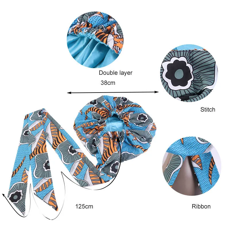 Головной убор для сна, атласная длинная двухслойная шапочка 38 см с Африканским принтом, с двойным слоем ленты, с узором, Женский чехол большого размера