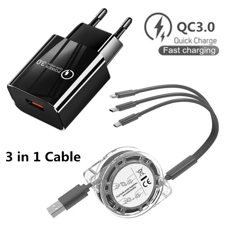 Быстрое зарядное устройство QC 3,0 с usb-портом для iphone 11, Samsung, Galaxy, Huawei, Xiaomi, Motorola G50 POCO, зарядное устройство 3 в 1, 8-контактный кабель Micro USB C