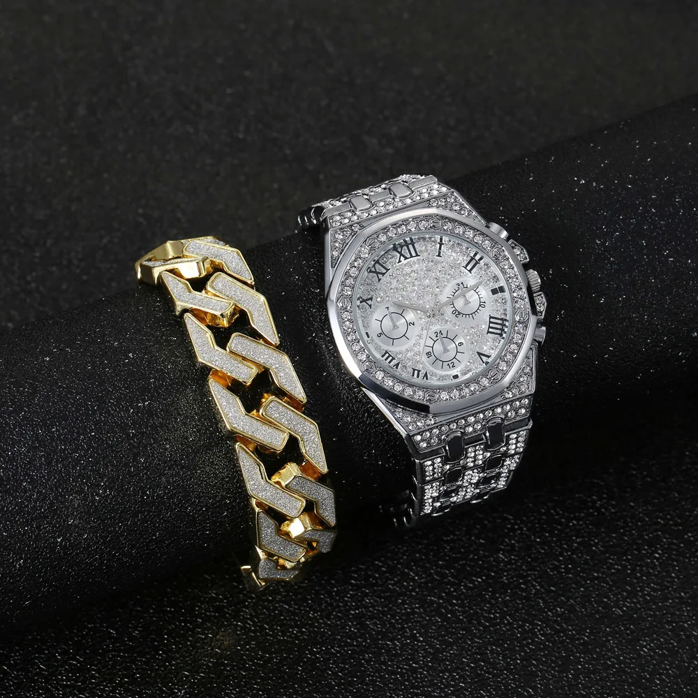 Мужские часы с браслетом из кубинской цепи, мужские часы со сверкающими камнями, роскошные золотые часы в стиле хип-хоп, мужской набор, мужские часы