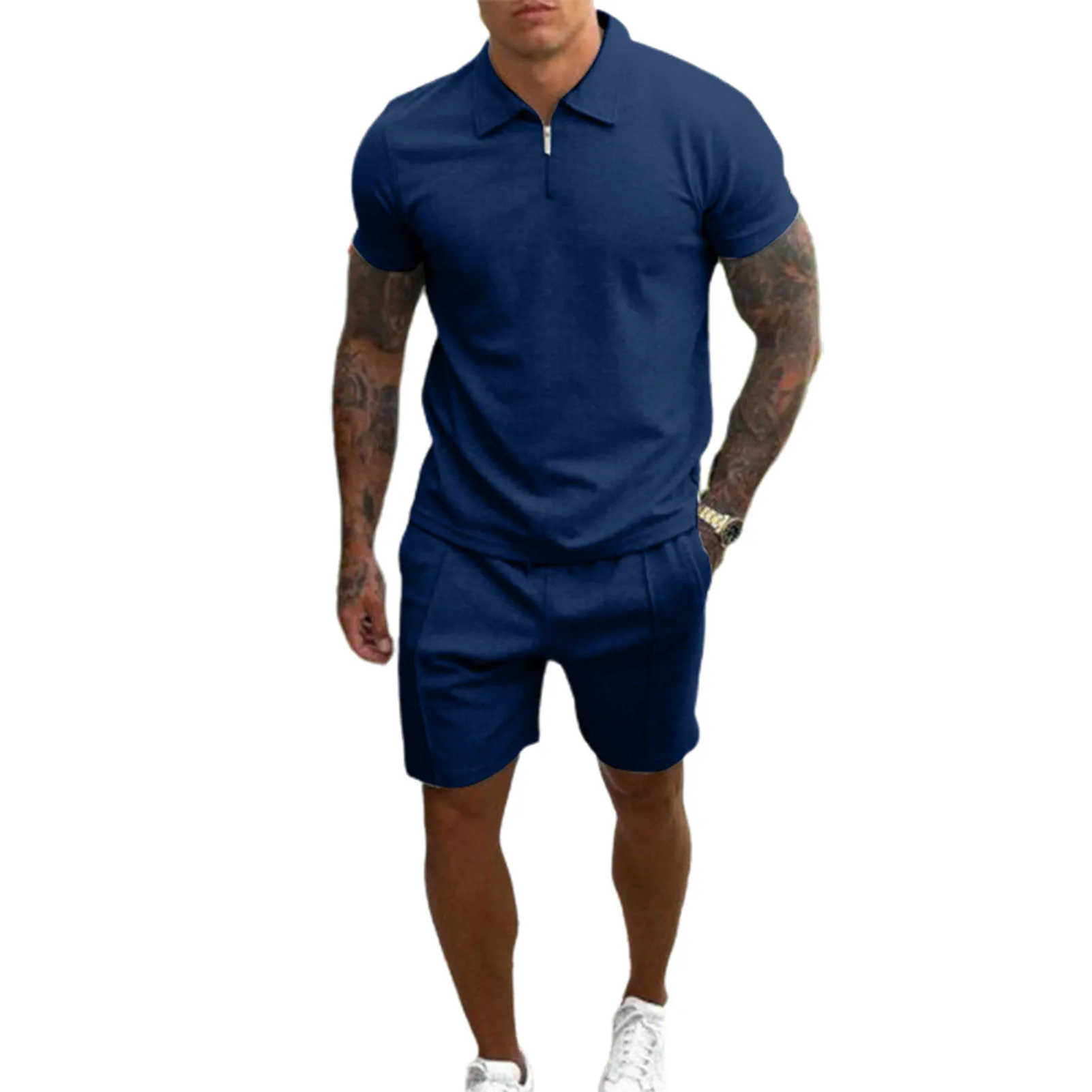 Мужская хлопковая рубашка-поло на молнии, короткий рукав, шорты, комплект из 2 предметов, мужской однотонный костюм с лацканами, спортивный облегающий тканевый костюм, лето 2021