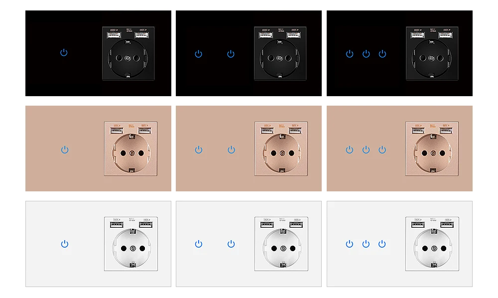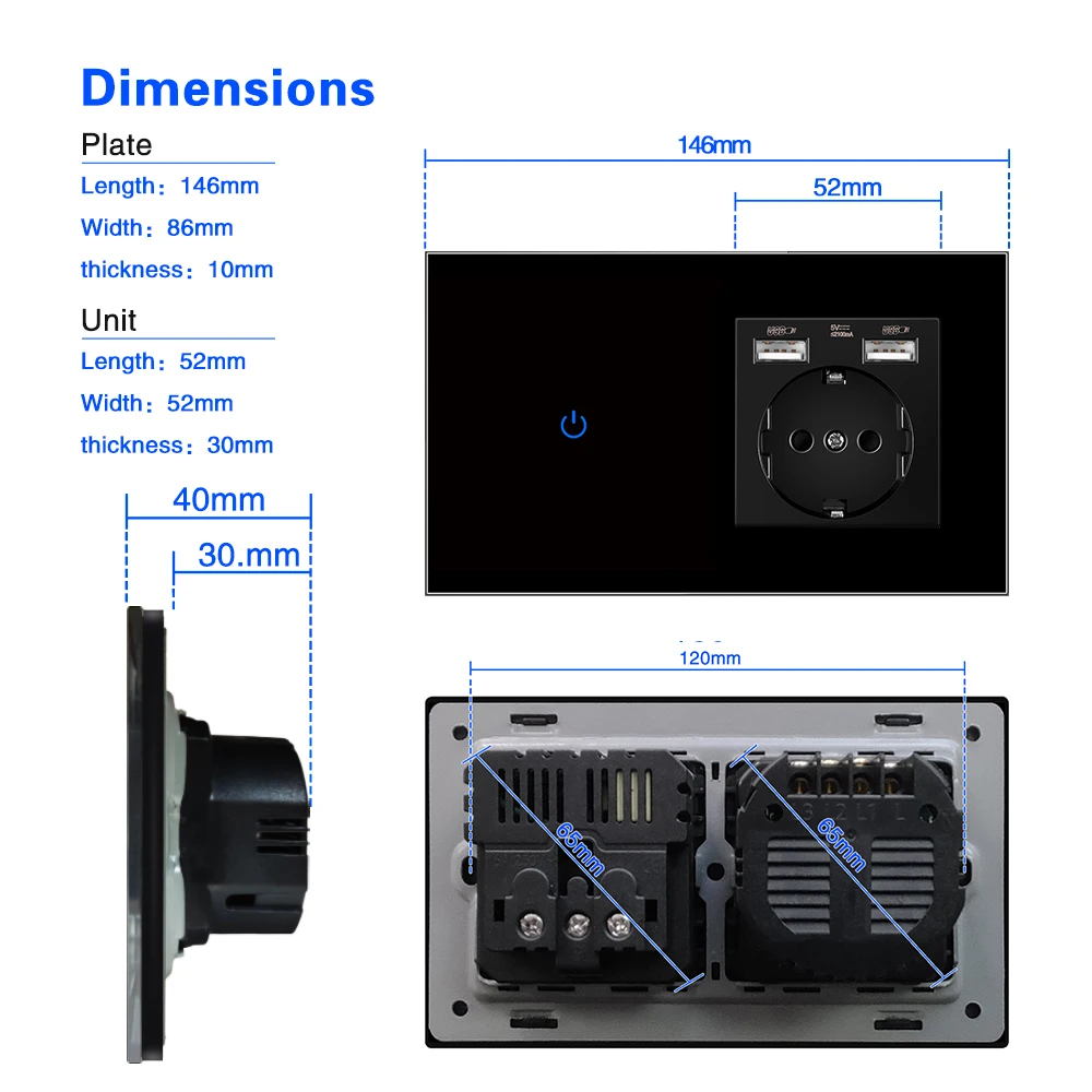 Размер панели: 146*86*10 ммСтандарт гнезда: немецкий стандартТип разъема для зарядки: USB 5V 2100mA