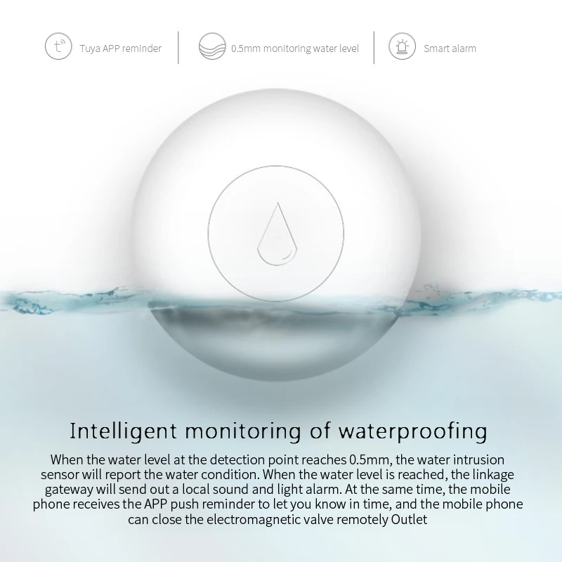 【Обнаружение в реальном времени】Датчик погружения в воду, который может обнаруживать утечку воды в окружающей среде в реальном времени. При обнаружении погружения в воду детектор отправит сигнал тревоги на хост и сообщит информацию на мобильный телефон пользователя. В тех случаях, когда уровень воды на обнаружение точка не достигнет 0,5 мм воды датчик вторжения сообщит о качества воды.【Сценическая связь】Предустановленная сцена безопасности реализуется через мобильное приложение. Как только уровень воды под контролем достигнет заданной высоты, будильник будет поднят удаленно. Когда ранний уровень воды будет достигнут, шлюз связи отправит сигнал локального звука и светильник, и мобильный телефон получит приложение push reminder, чтобы сообщить вам вовремя, И мобильный телефон может закрыть выход воды удаленным электромагнитным клапаном【Новое Обнаружение】Adopt advanced detection module, измерение водного тела в реальном времени. Когда застой воды течет через два полюса зонда, сигнал тревоги будет отправлен на шлюз немедленно.