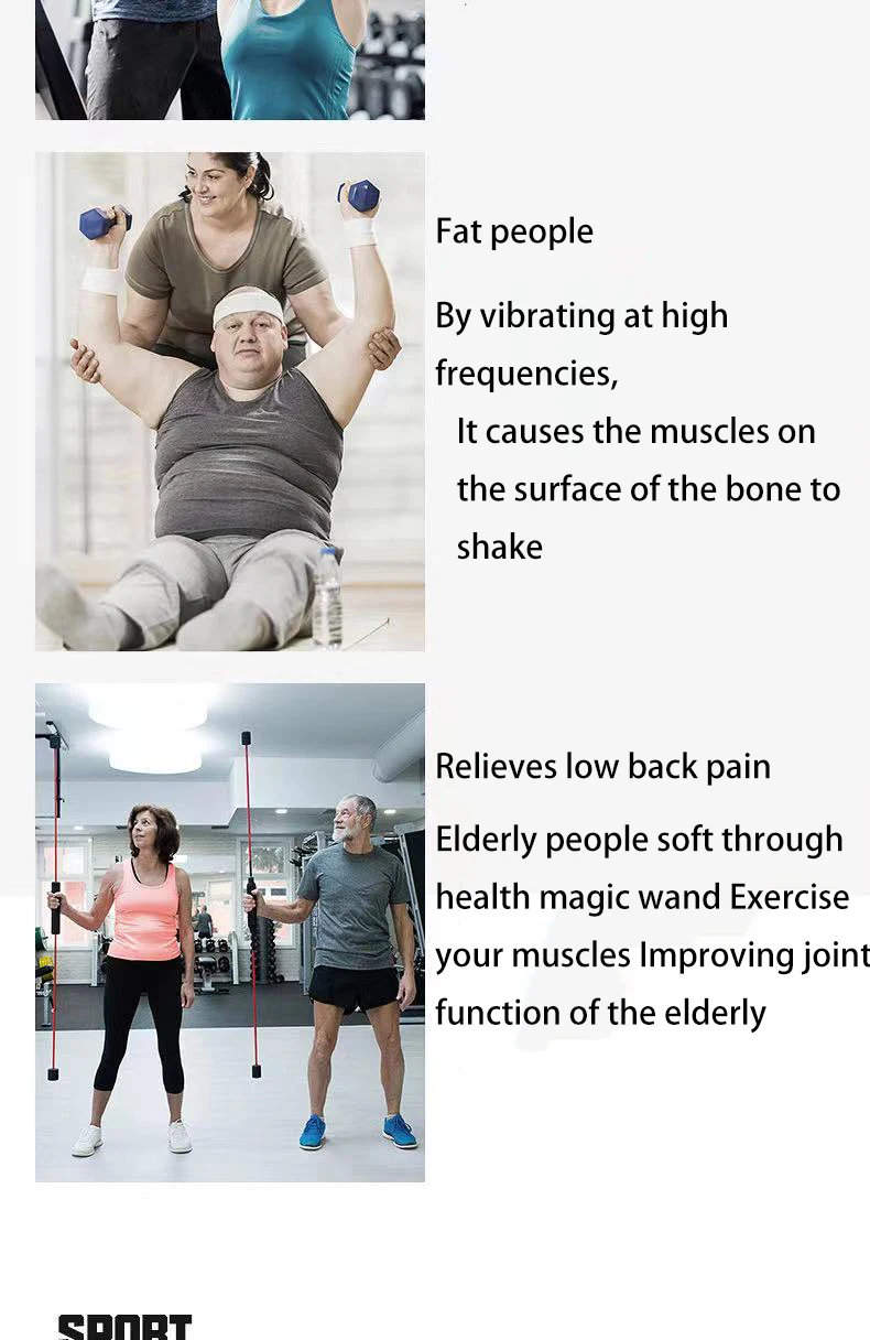 1. Мощное оборудование: эластичная фитнес-палка изготовлена из стекловолокна, а ручка и противовес на обоих концах изготовлены из резины. Палка может производить вибрацию 5 Гц. Палка может использоваться для сидения, стоя, движения или балансировки, подходит для всех возрастов и уровня фитнеса.