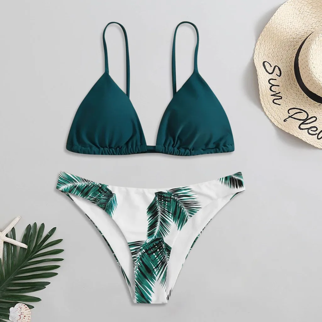 Женский комплект бикини с чашками пуш-ап и поясом с принтом листьев