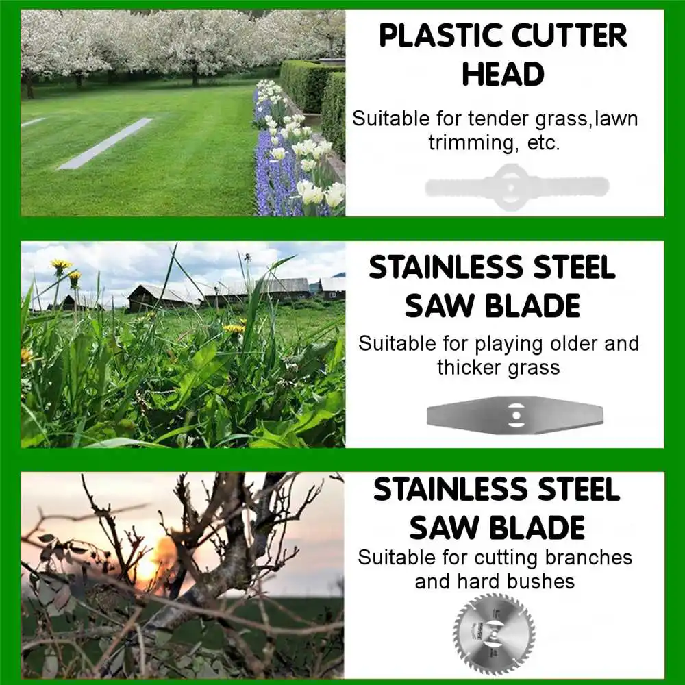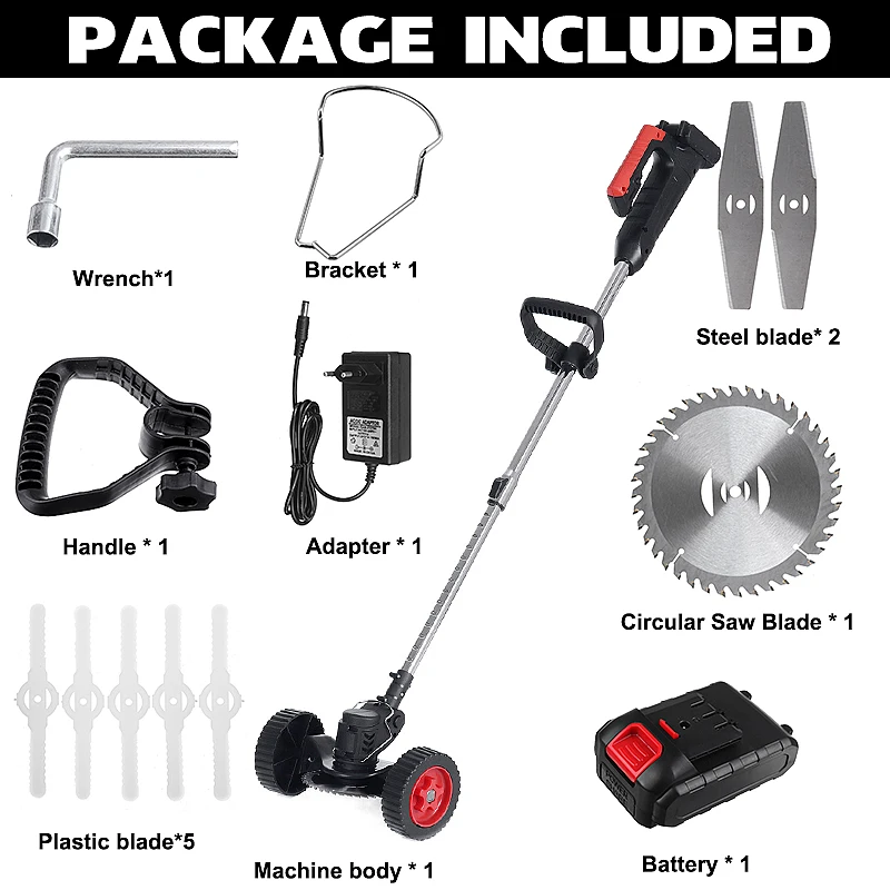 -Мощность: 1800 Вт-Аккумулятор: литиевый аккумулятор 88 в без нагрузки-Подходит для инструментов с прямым валом садовая газонокосилкаОсобенности:-Не запутанный шнур-Без грязного бензина-Работает с стандартные стяжки-молнии-Мощный триммер в ладонях-Работа на аккумуляторе, экономия энергии и времени-Регулируемый штатив позволяет обрезать все труднодоступные места.-Специально разработан для всех, кто ежедневно работает в саду.-Защитный щит для мусора для обеспечения дополнительной безопасности, сохранит работу-простая конструкция, легко заменить и использовать. Особенно подходит для инструментов с прямым валом садовая газонокосилка.-Изготовлен из высококачественного марганца, твердый и прочный.-Лезвие имеет импортную технологию и утолщенный интерфейс.Примечание:1. Возможны отклонения в 1-3 см из-за ручного измерения. Перед размещением заказа, пожалуйста, внимательно ознакомитесь со всеми условиями.2. Цвета на дисплеях могут отличаться, надеемся на понимание.