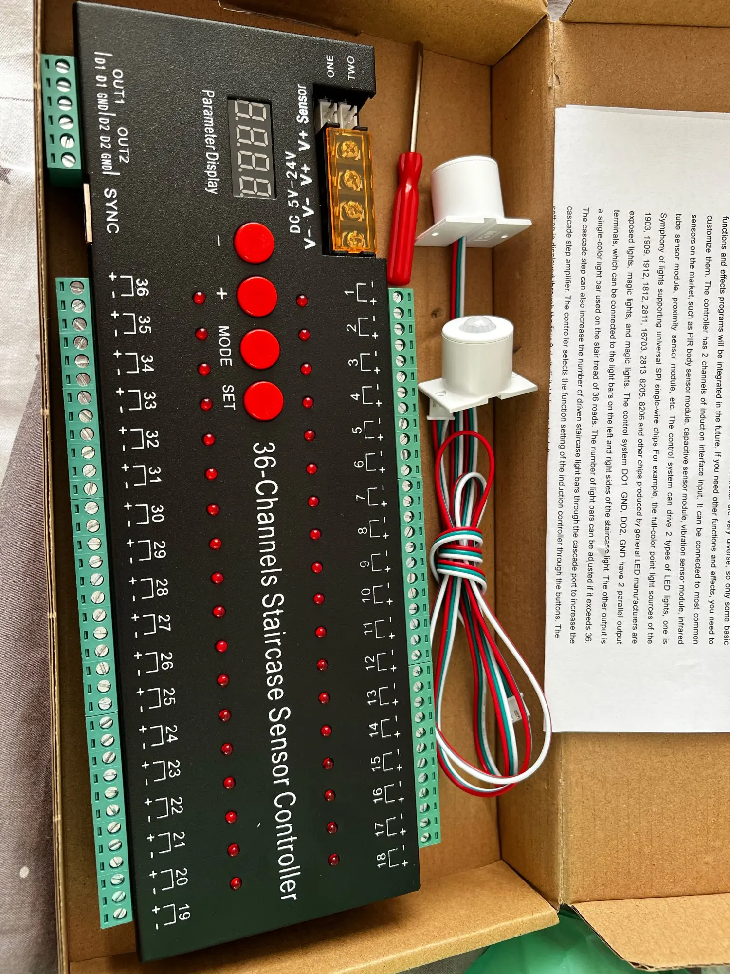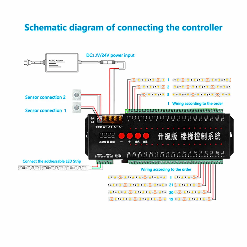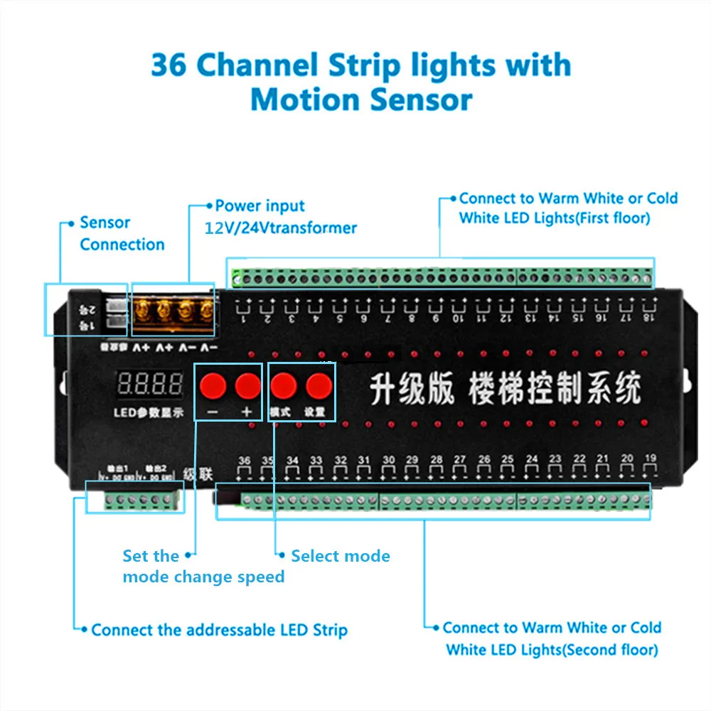 1. Контроллер имеет два интерфейса устройства для обнаружения человека, которые отмечены сенсорным подключением в верхней левой части изображения.2. Правая сторона маркированного сенсорного соединения находится там, где продукт подключен к источнику питания. Он имеет два источника питания с положительными полюсами и два источника питания с отрицательными полюсами. При подключении необходимо одновременно подключить любой из положительных и отрицательных полюсов, чтобы устройство было нормально работать.3. Далее расположены порты с арабскими цифрами 1-36. Они относятся к количеству ваших шагов. Если количество шагов составляет всего 10, вам нужно всего лишь подключить 10 портов 1-10. Просто Отрегулируйте данные устройства (Там будут инструкции по регулировке ниже). Если у вас есть 15 шагов, подключите светильник к области 1-15. По аналогии, если есть 36, вы можете идеально подключиться к портам 1-36. Если у вас более 36 шагов. Вам нужно купить второе устройство, чтобы завершить ремонт. На рисунке изображен теплый белый или холодный белый светодиодный светильник s (первый этаж) и подключение к теплому белому или холодному белому Led светильник s (второй этаж) это позиции, в которых светильник соединен с монохромными лестницами.4. Светильник, подключенный к месту, отмеченному «Подключите адресуемую светодиодную ленту»,-это водяной светильник на стене лестницы. Он имеет два порта, «OUT1» и «OUT2» соответственно имеют 3 порта подключения, и «DO» подключен к сигнальной линии pixel dot. «GND» подключается к отрицательному проводу одной розетки сигнального провода. В общей сложности два порта можно подключить к 12V 2811 светильник-бар с пиксельной точкой 40 метров (100 пикселей на 5 метров светильник-бар). Два порта могут быть подключены к общей сложности 800 пикселей. Вы можете подключить светильник бар в соответствии с количеством пикселей вашего светильник бар.5. Четыре красные кнопки на устройстве, "-" "+" "режим" набор ". Они предназначены для регулировки количества шагов, контролируемых оборудованием, светильник и скорость тушения планки светильник, выбор цвета бар светильник на стороне лестницы, длина и скорость струящейся воды. Эти четыре кнопки должны сотрудничать для завершения.