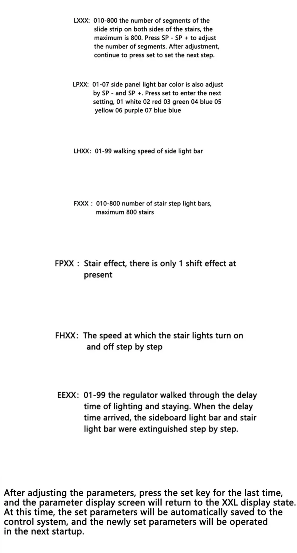 3. Нажмите «SET» в третий раз, чтобы отобразить «LH10», нажмите «-», чтобы увеличить скорость потока, самый быстрый-«LH01», нажмите «+», это медленно, И самое медленное-«LH99». Вы можете настроить скорость со стороны воды светильник бар в соответствии с временем вы подъем по лестнице, и установите его на той же скорости, как вы сопровождать лестницы или спуск по лестнице.